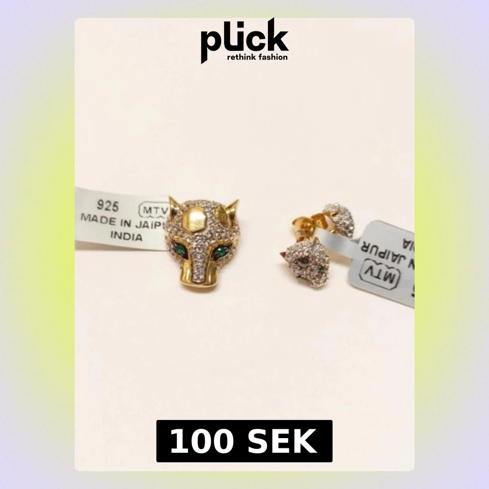 Smyckeset i form av leopardhuvuden i guld och silver med gröna detaljer. Hänge och örhängen.