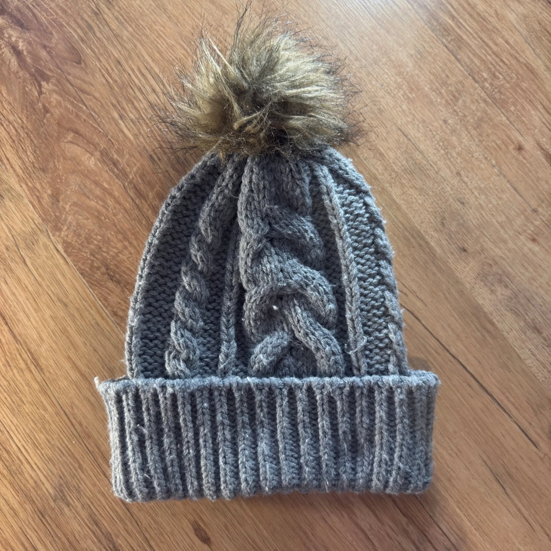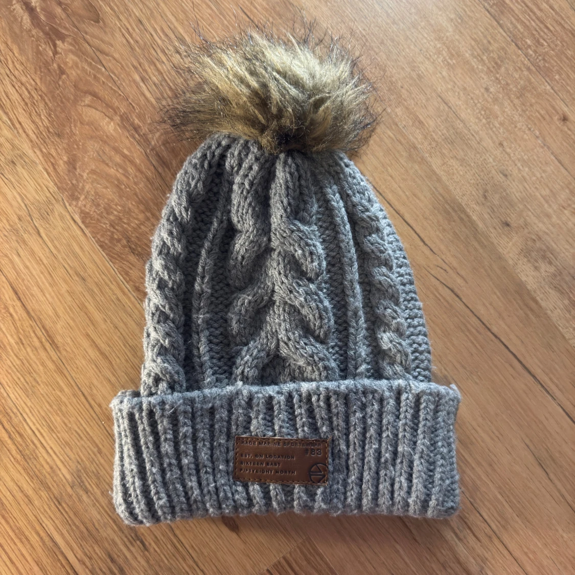 Snygg grå stickad mössa från Race Marine med grova flätor och bred uppvikt kant. På toppen sitter en fluffig fuskpälsboll i bruna toner. Mössan har en brun patch framtill och är tillverkad i 100% akryl. I fint skick!