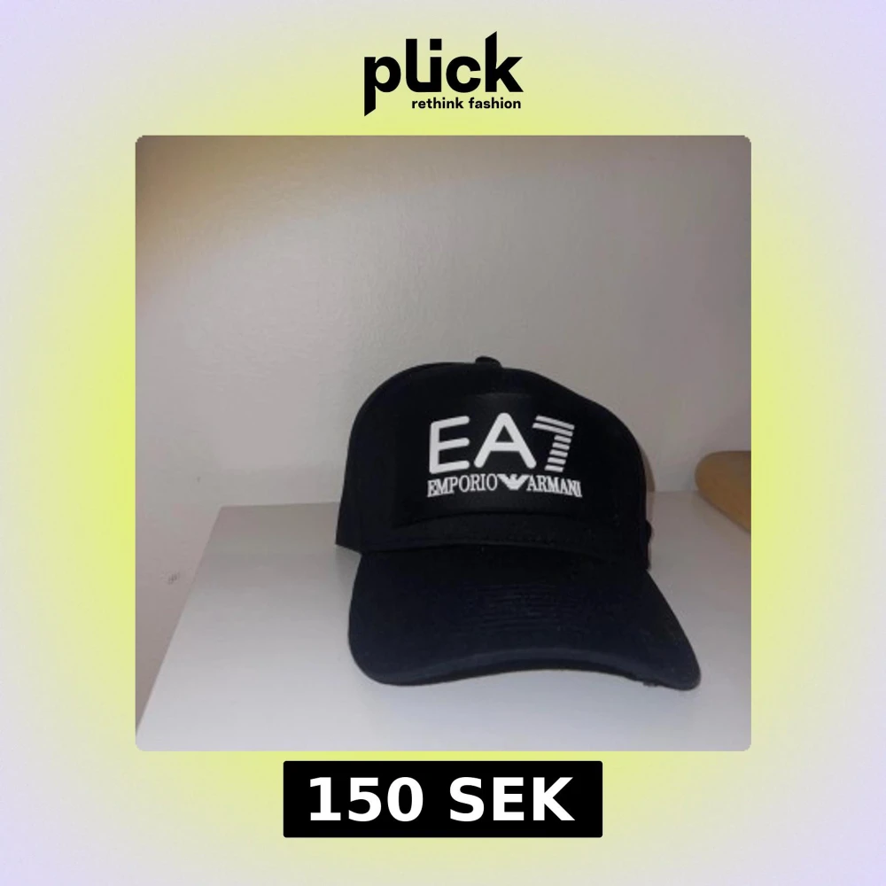 Säljer en svart EA7 keps som är i bra skick. Varan har ett stort tryck på framsidan.