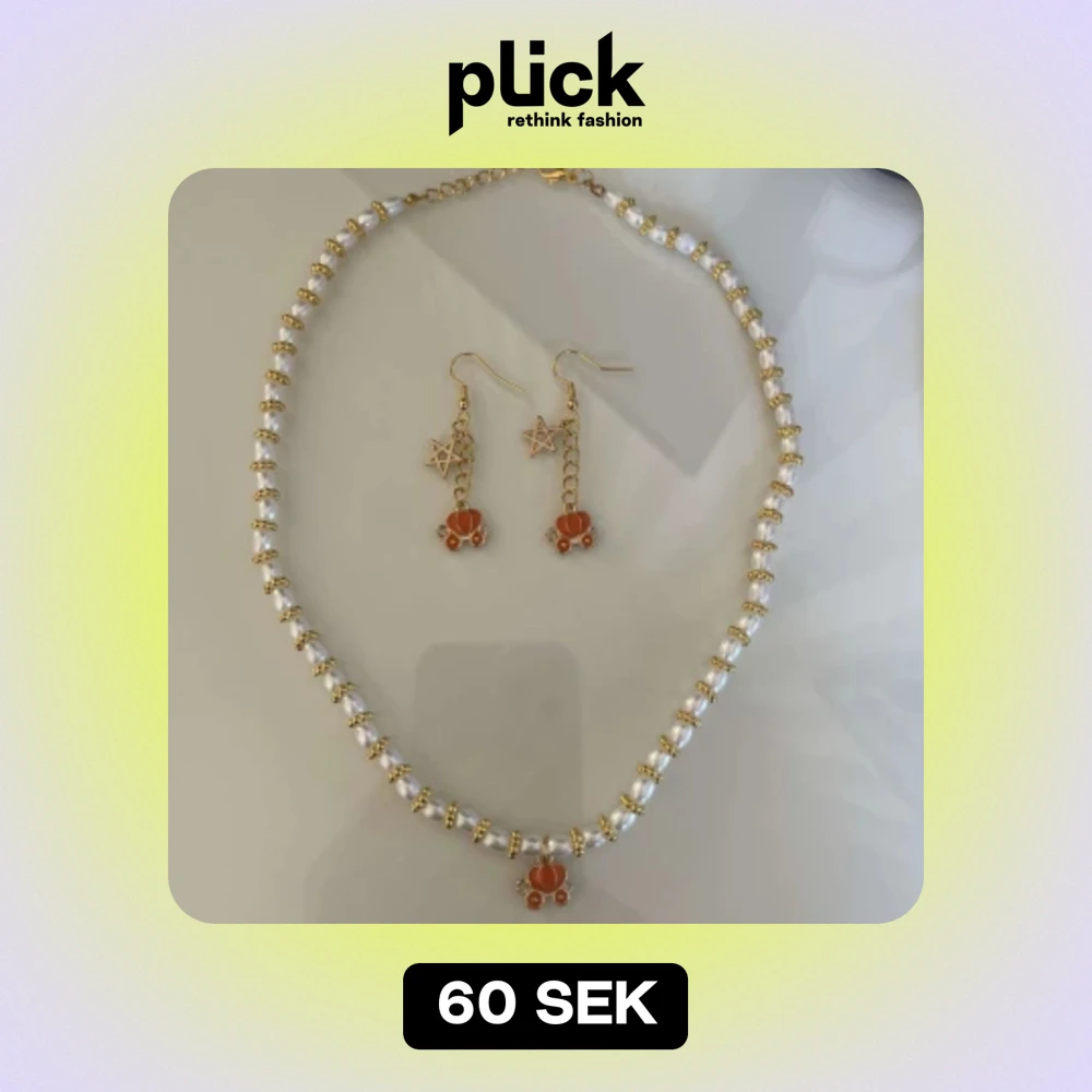 Snyggt set med ett guldhalsband och matchande örhängen. Halsbandet har vita pärlor och en orange detalj i mitten. Örhängena har stjärnor och orangea detaljer som matchar halsbandet. Perfekt för att glamma upp din outfit till fest eller speciella tillfällen!