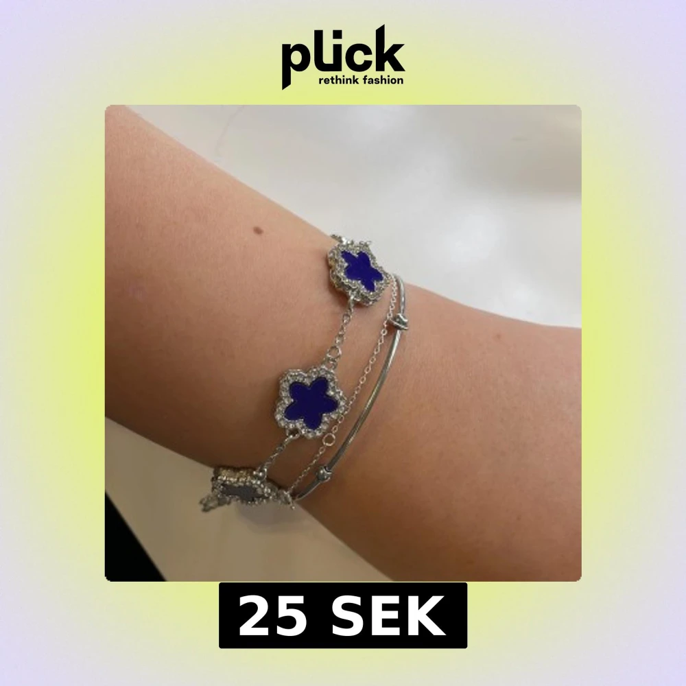 Elegant silverarmband med flera blå blomformade hängen. Varje blomma är omgiven av en glittrande kant som ger en lyxig känsla. Perfekt för att lägga till en färgklick till din outfit.