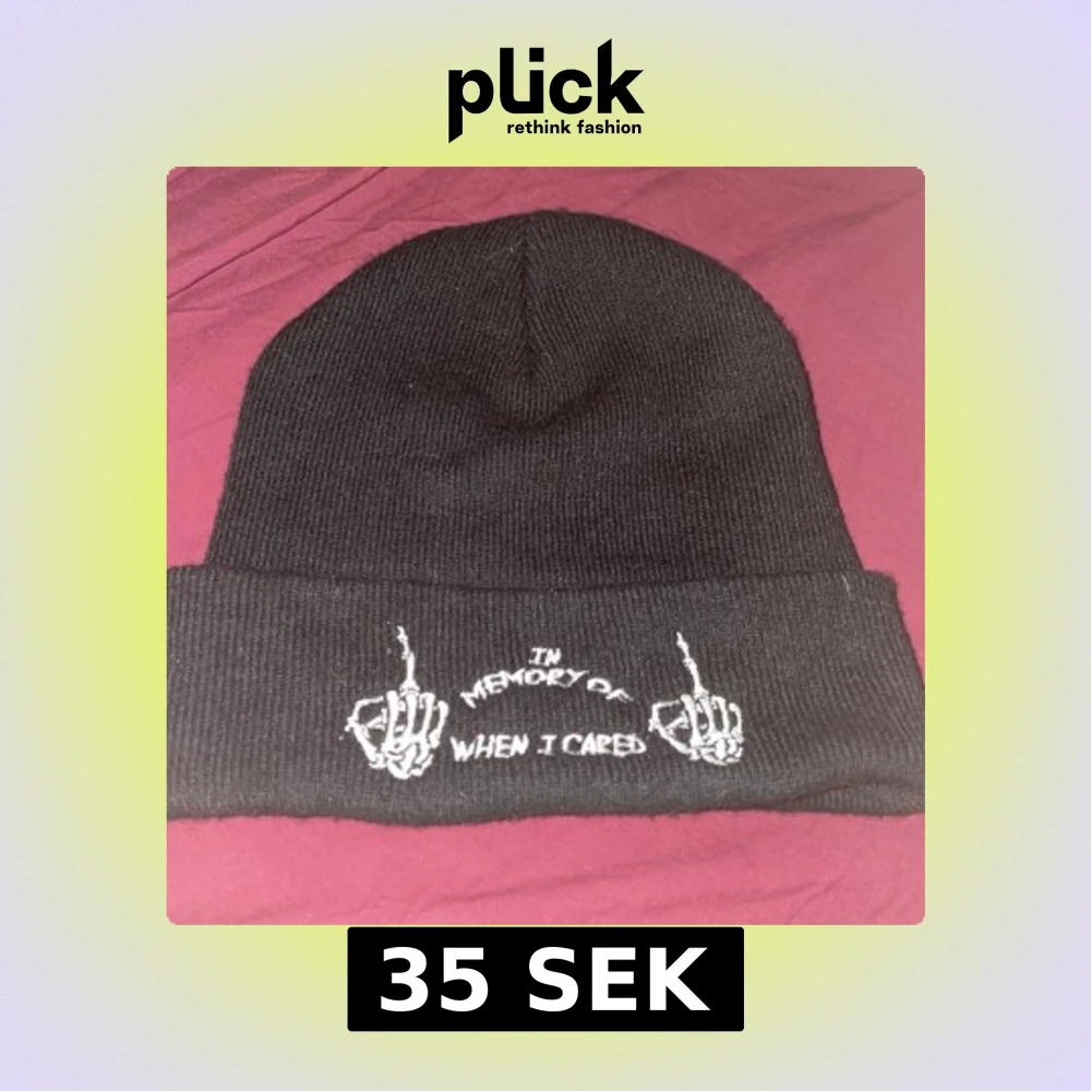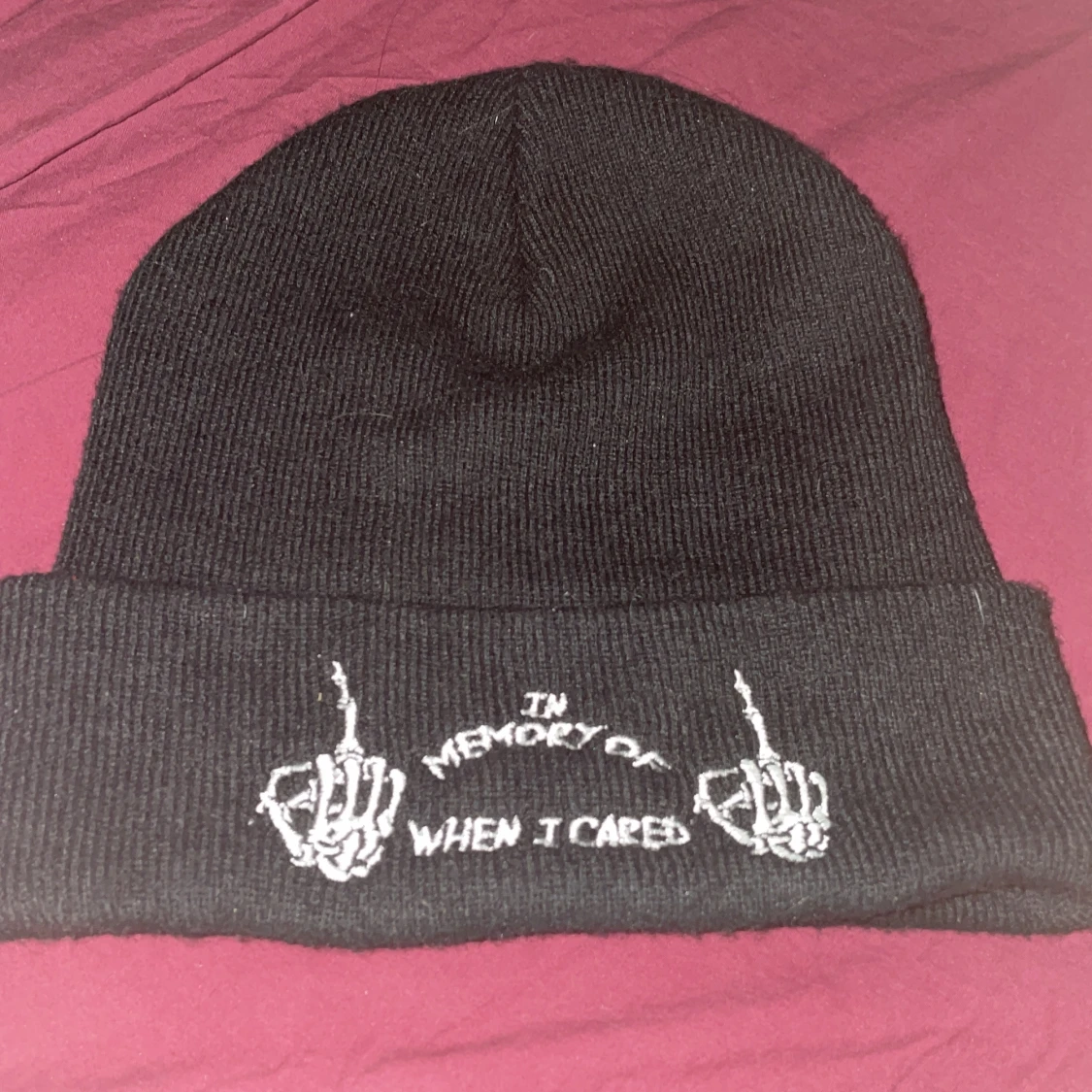 Svart ribbstickad mössa med uppvikt kant och vit brodyr framtill. Texten 'In memory of when I cared' är broderad mellan två skelett-händer som visar långfingret. Perfekt accessoar för en edgy streetstil.