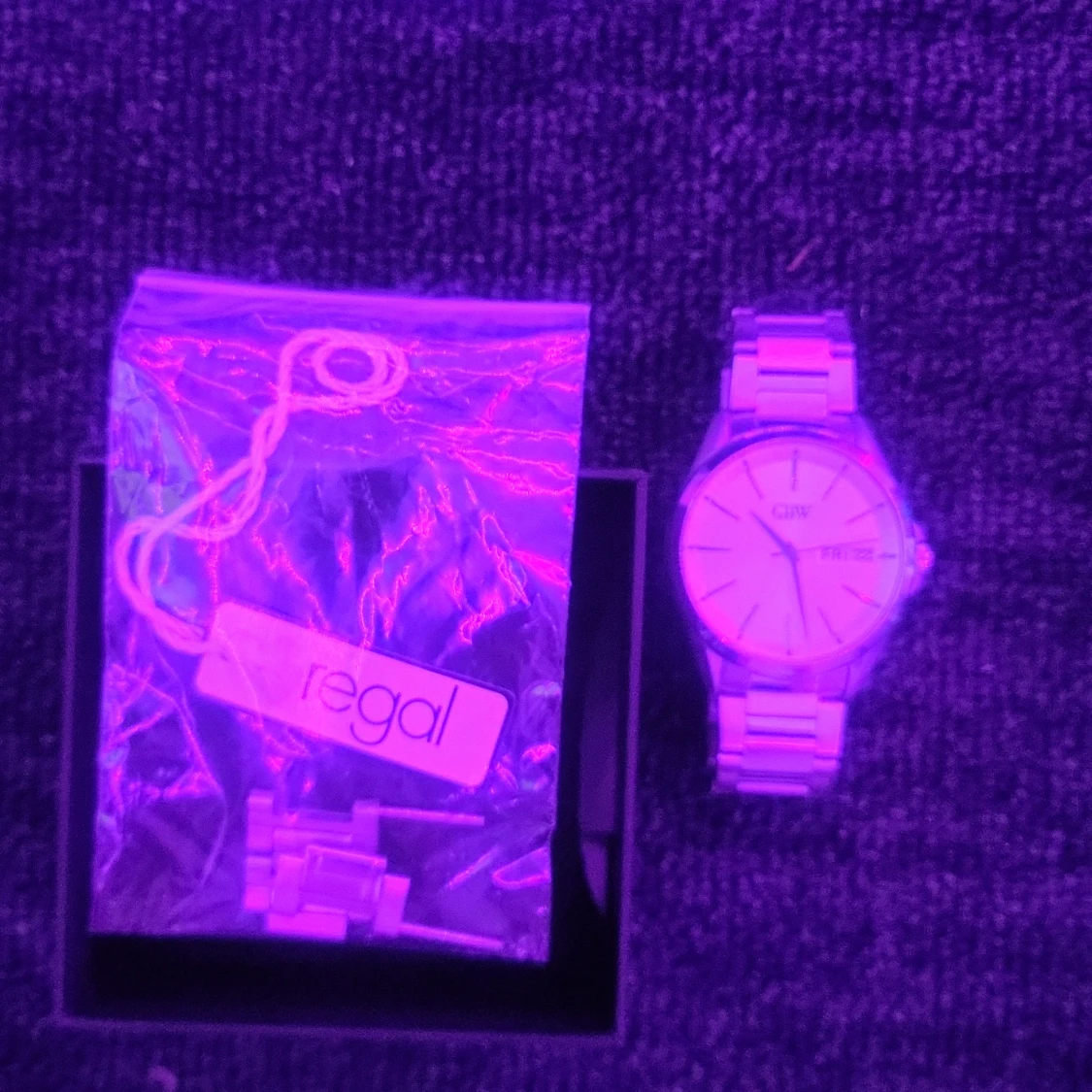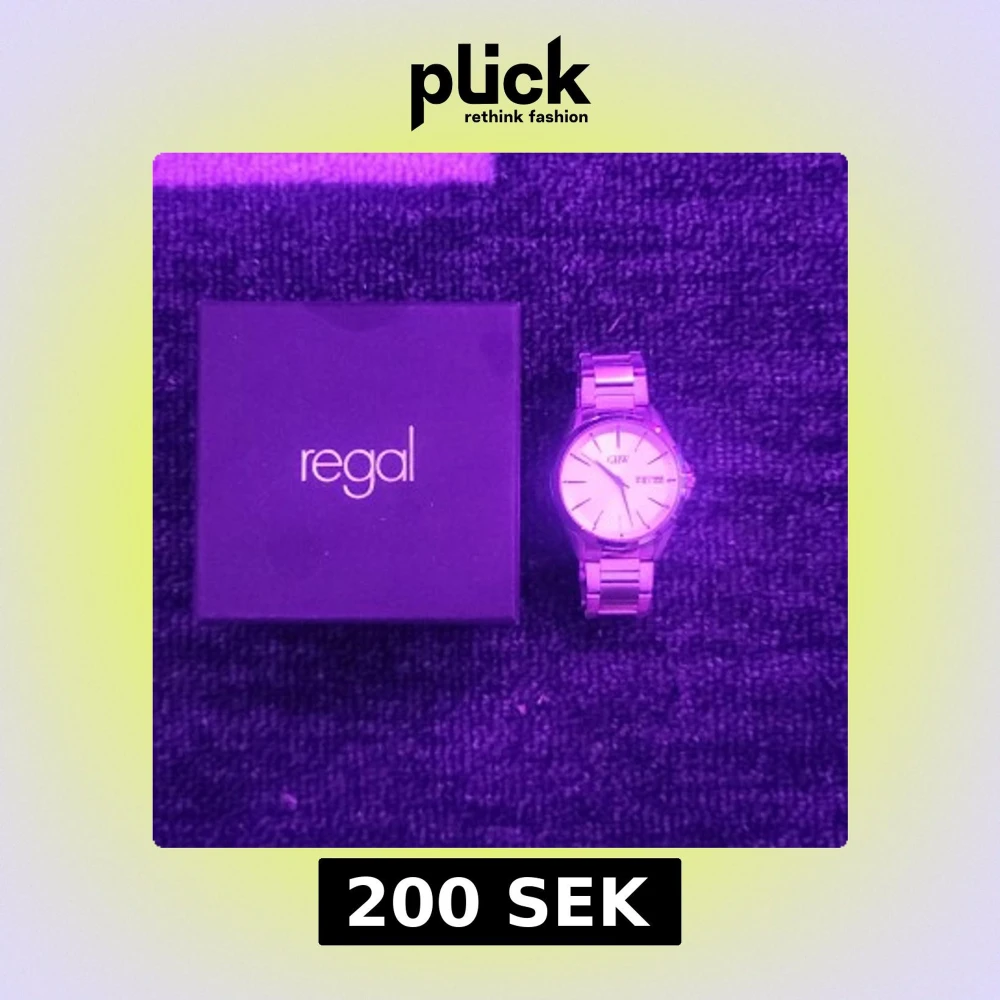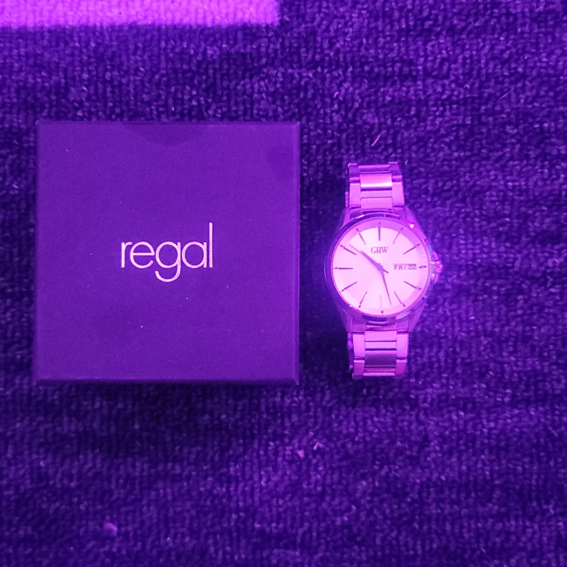 Stilren klocka från Regal med GHW på urtavlan. Klockan har rund form, silverfärgad länkarmband i rostfritt stål och vit urtavla med dag- och datumvisning. Levereras med originalask och extra länkar. Perfekt accessoar för dig som gillar klassisk design.