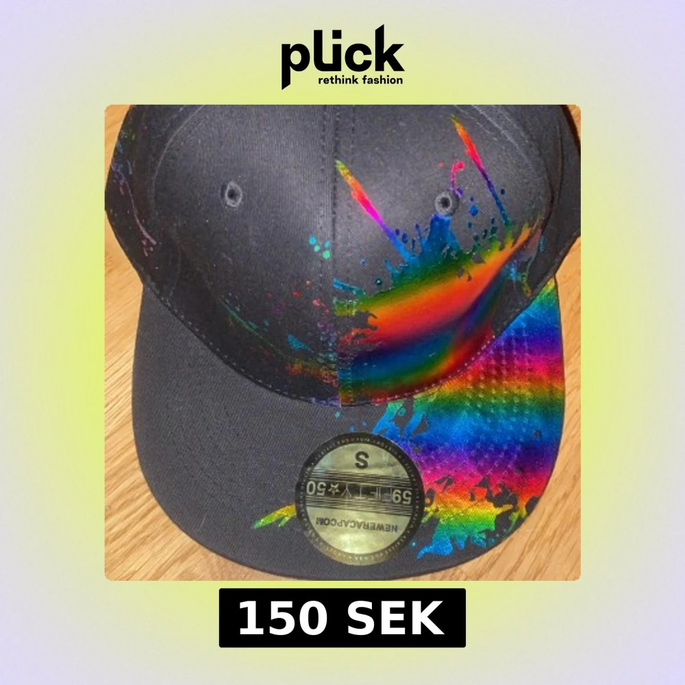 Säljer en svart keps från New Era med ett färgstarkt regnbågsstänkmönster över sidan och skärmen. Kepsen har platt skärm och klassisk passform. Perfekt för dig som vill sticka ut med en unik och färgglad stil.