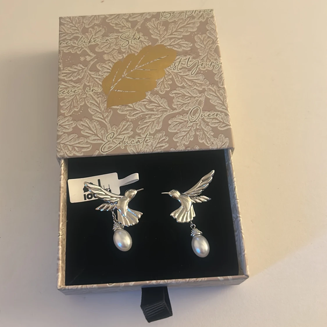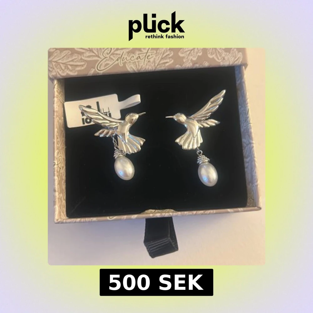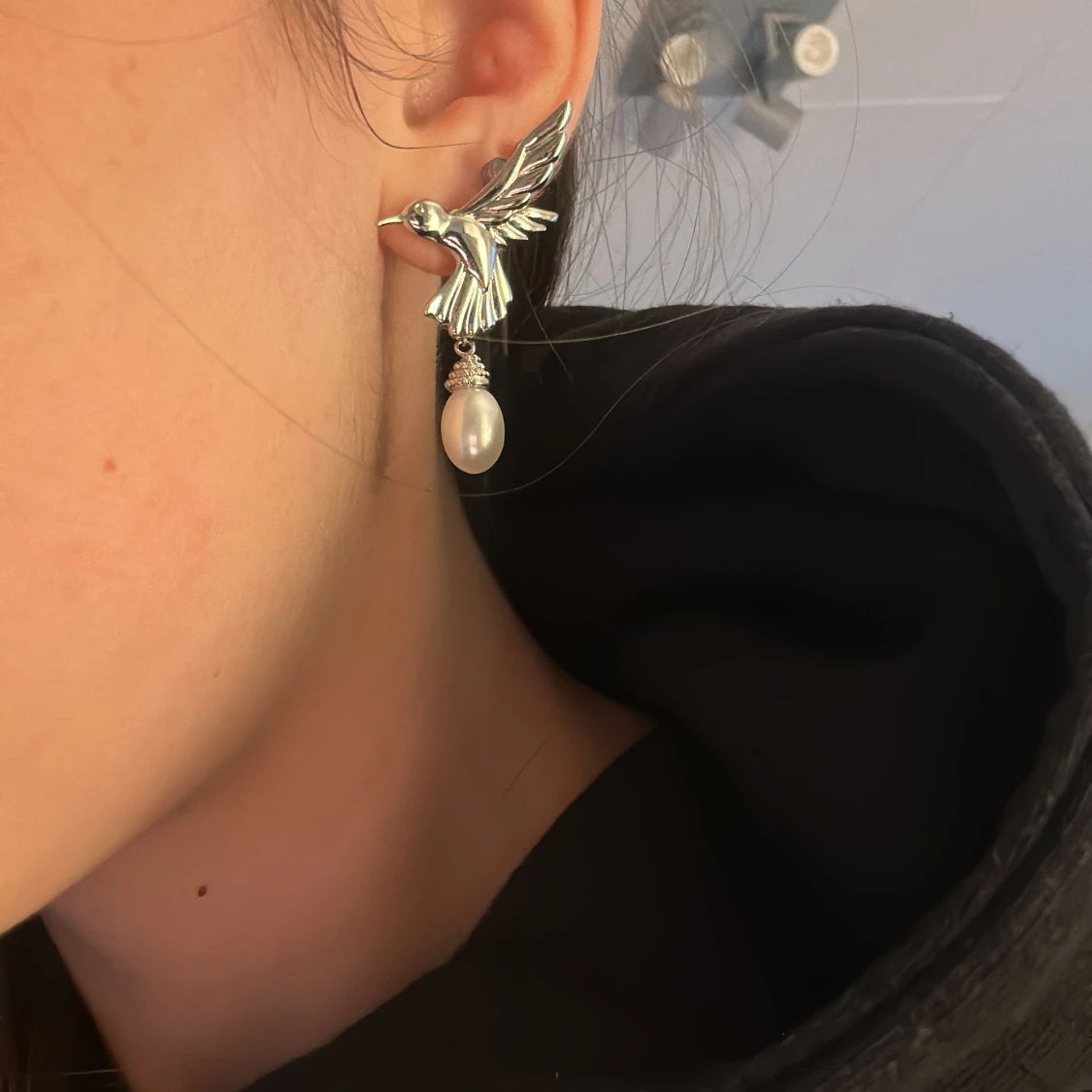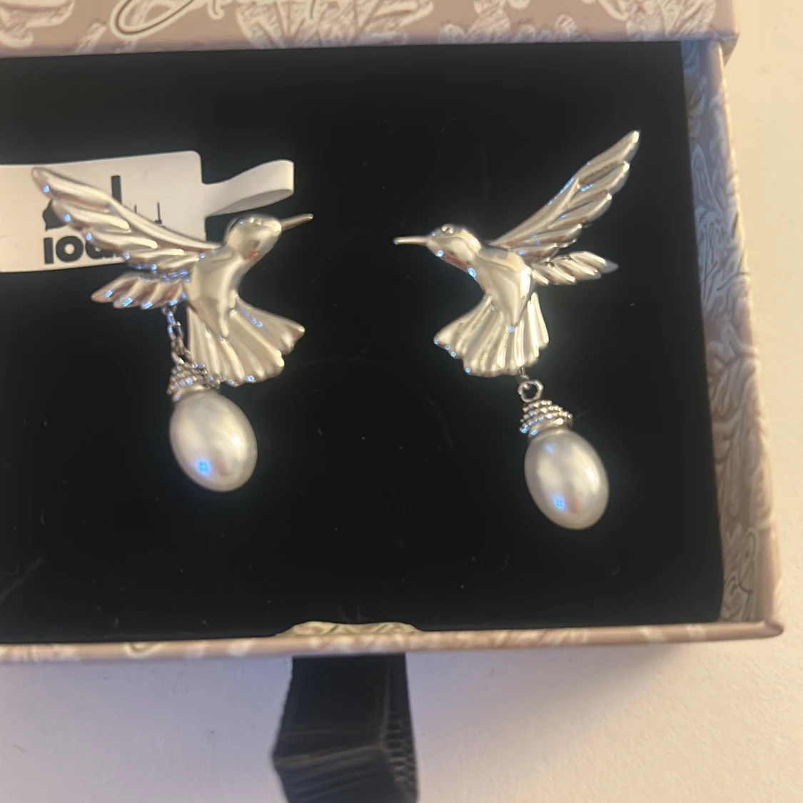 Unika örhängen i form av silverfärgade kolibrier med hängande vita pärlor. Fågelns vingar är detaljerade och örhängena ger en cool och elegant vibe. Perfekta för dig som vill sticka ut med ett smycke som känns både lekfullt och stilrent.