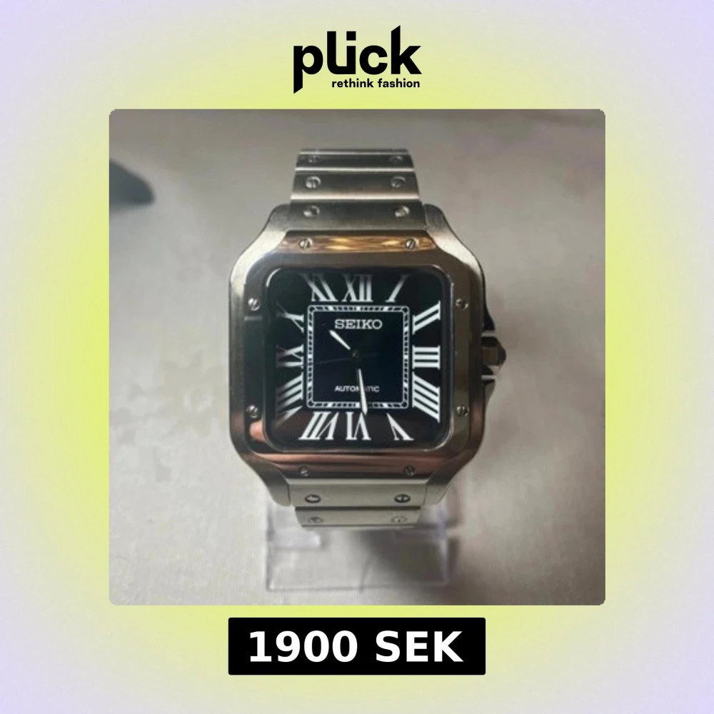 Snygg Seiko mod klocka med fyrkantig boett i borstat stål och svart urtavla med vita romerska siffror. Länken är i stål och har ett robust viklås. Genomskinlig baksida visar det mekaniska verket. Perfekt för dig som gillar stilren design.