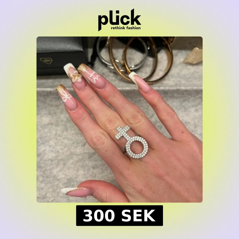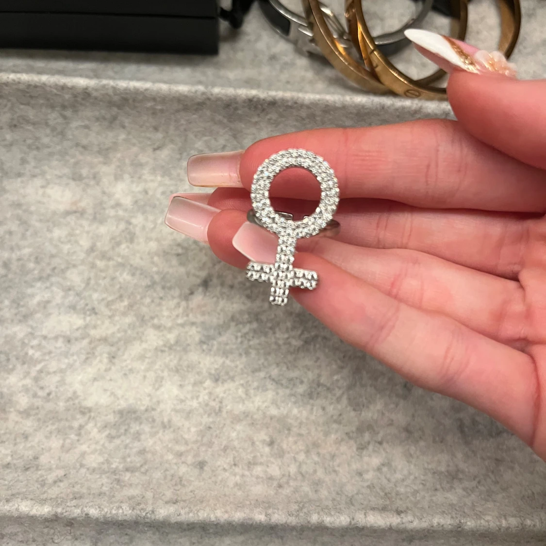 Unik statementring i form av en kvinnosymbol, täckt av glittrande stenar. Ringe är ingen Ioaku. Det är lite rost på undersidan av ringen som du ser på bild tre men det syns inte med ringen på.