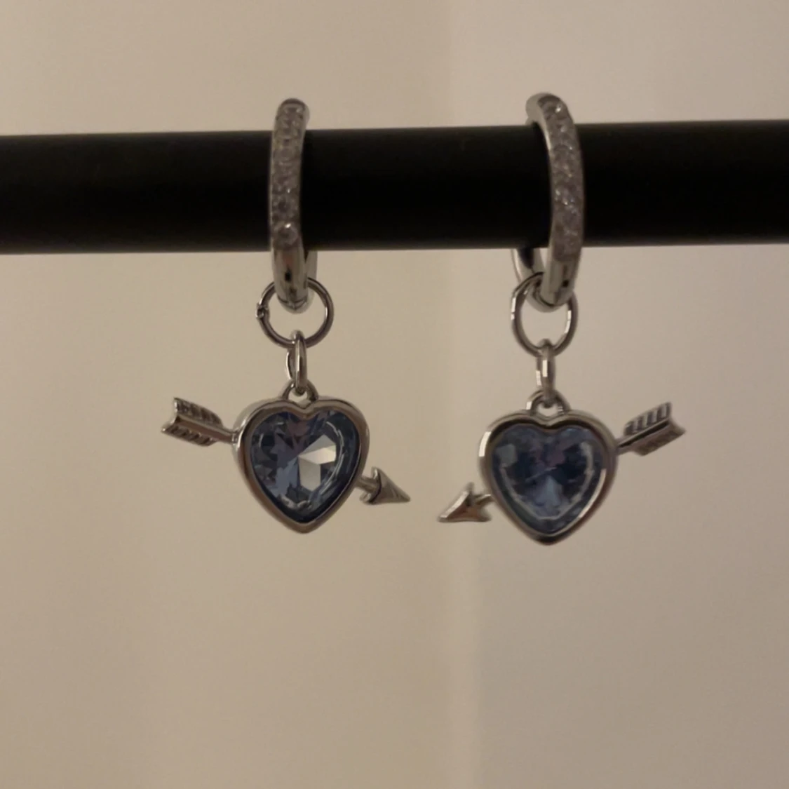 Säljer ett par snygga örhängen i silverfärg med glittrande blå hjärtformade hängen och pil-detaljer. Ringarna har små gnistrande stenar och hängena är formade som hjärtan med en pil igenom, vilket ger en cool och romantisk vibe.