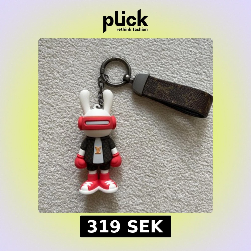 Cool nyckelring från Vuitton med en vit kaninfigur i svart -mönstrad outfit, röda handskar och sneakers samt röda hörlurar. Nyckelringen har en brun rem i klassiskt -monogram och metallfäste. Perfekt accessoar till väskan eller nycklarna.