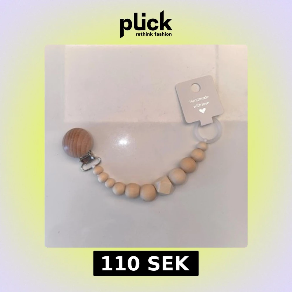Säljer en handgjord napphållare med träkulor i olika storlekar och en hexagonformad detalj. Den har en praktisk klämma i metall för enkel fastsättning. Perfekt för att hålla nappen nära till hands.