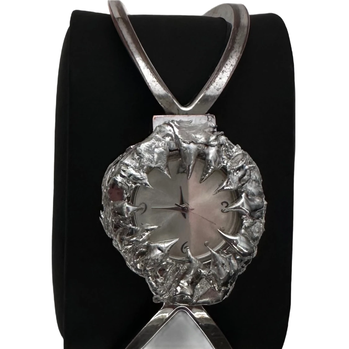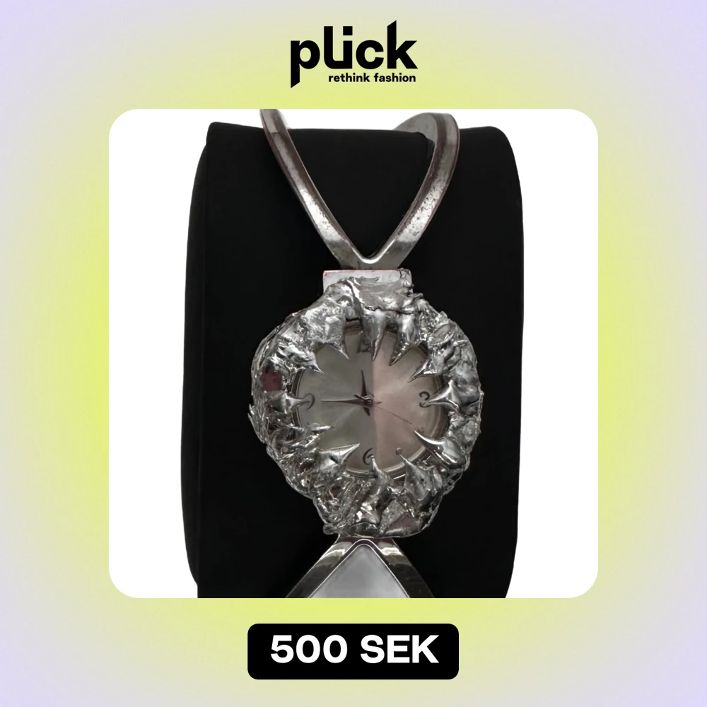 Säljer en unik klocka med en cool, glittrig design. Den har en silverfärgad urtavla med ett konstnärligt, nästan smält utseende runt kanterna. Perfekt för att sticka ut på festen! Armbandet är i matchande silver och ger en futuristisk känsla. Passar perfekt för den som vill ha något annorlunda och iögonfallande.