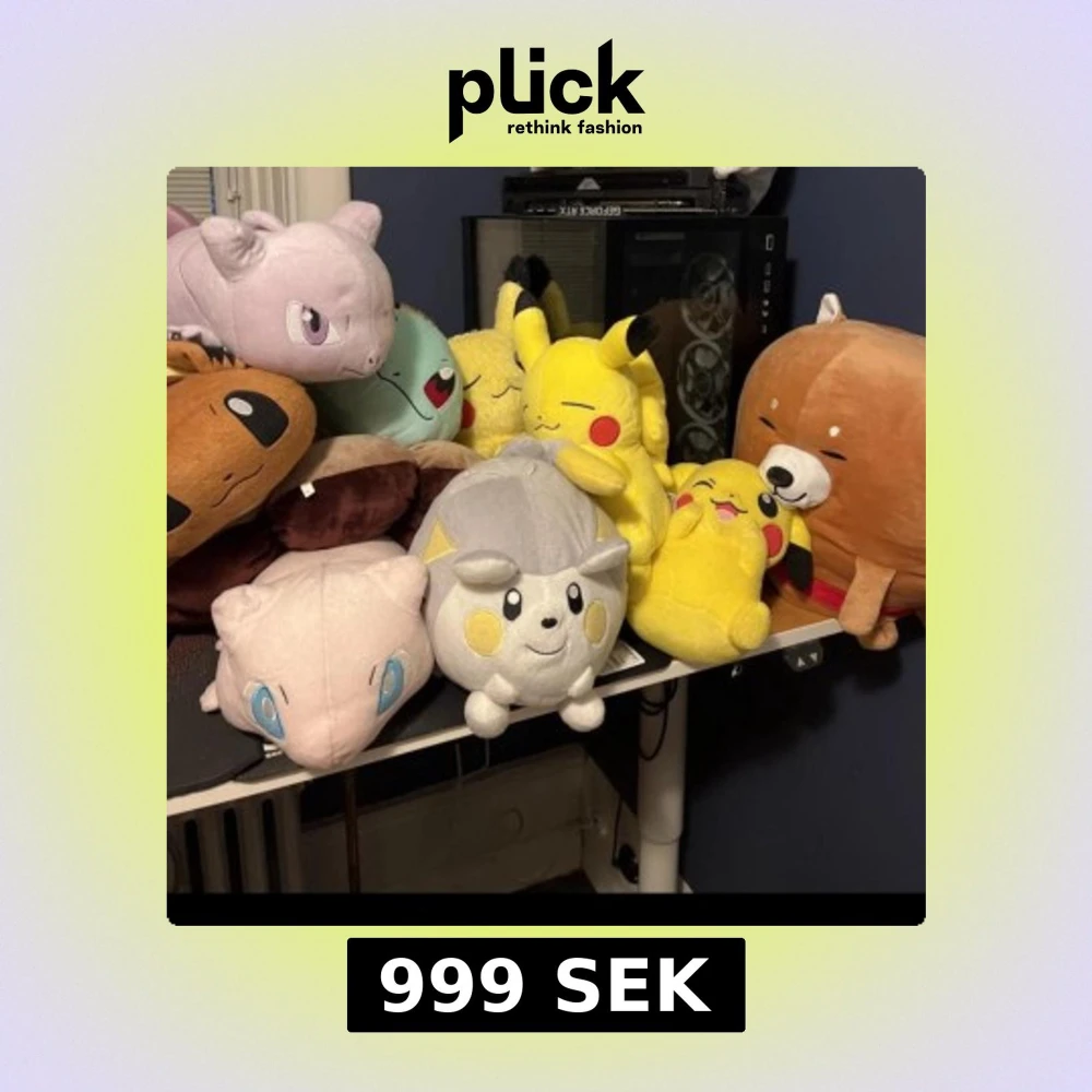 En samling av stora och mjuka Pokémon-gosedjur, inklusive populära karaktärer som Pikachu och Mew. Perfekt för Pokémon-fans som vill ha en mysig och färgglad dekoration i rummet. Gosedjuren är i olika färger och storlekar, vilket gör dem till en rolig och varierad samling.
