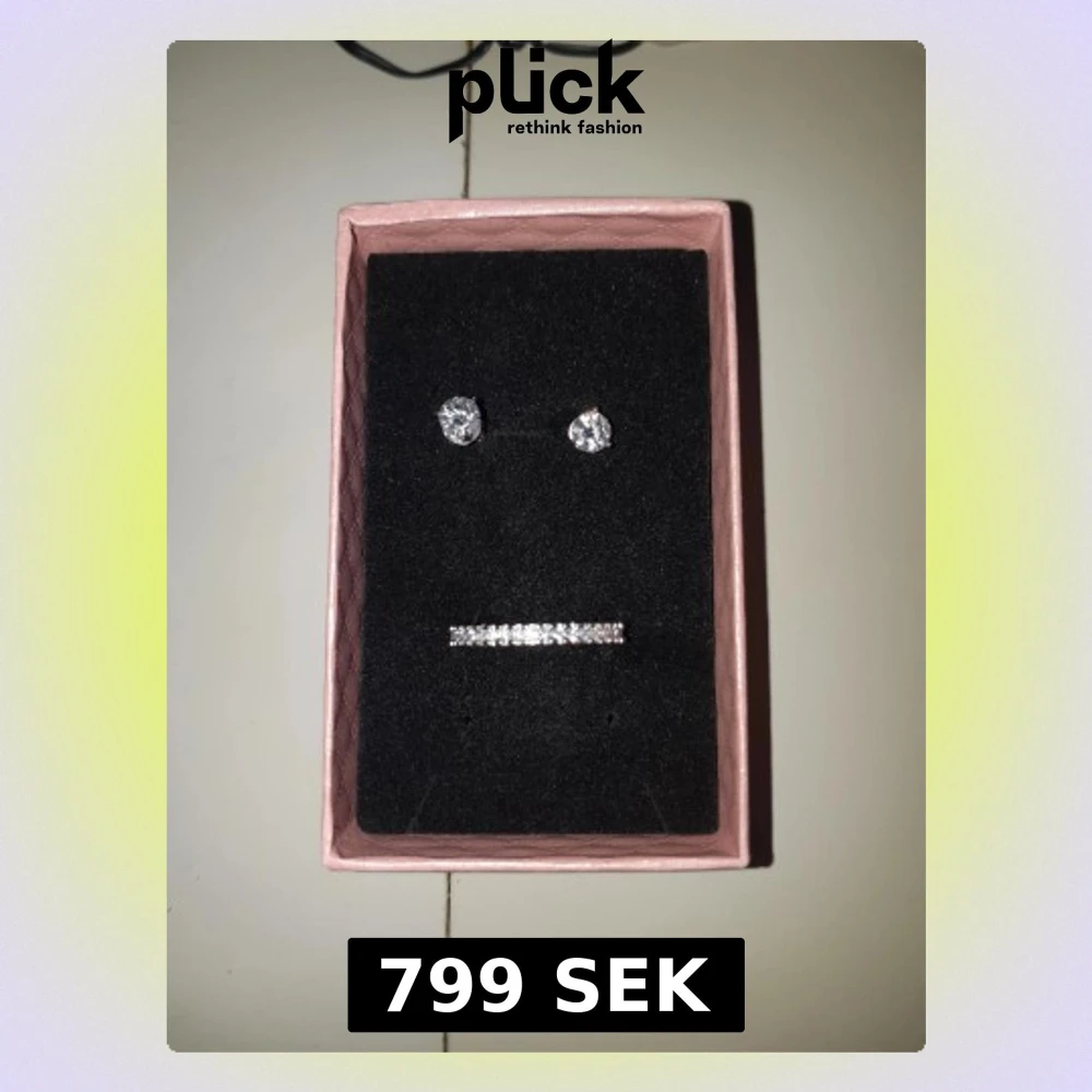Säljer ett snyggt smyckeset med ett par silvriga örhängen med gnistrande stenar och en matchande ring med rad av klara stenar. Kommer i en rosa quiltad ask, perfekt som present eller till dig själv.