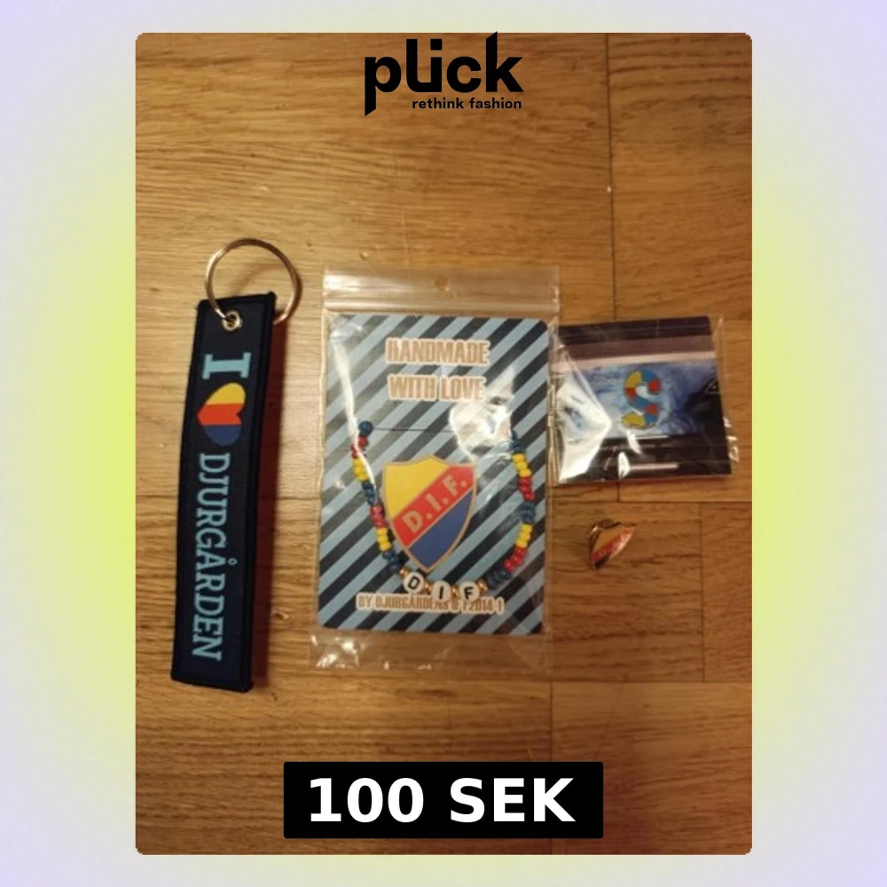 Paket med supporteraccessoarer från Djurgården: nyckelring med texten 'I ❤️ Djurgården', pärlarmband i klubbens färger med DIF-bokstäver,två pins med klubbsköld. . Perfekt för Djurgården-fans!