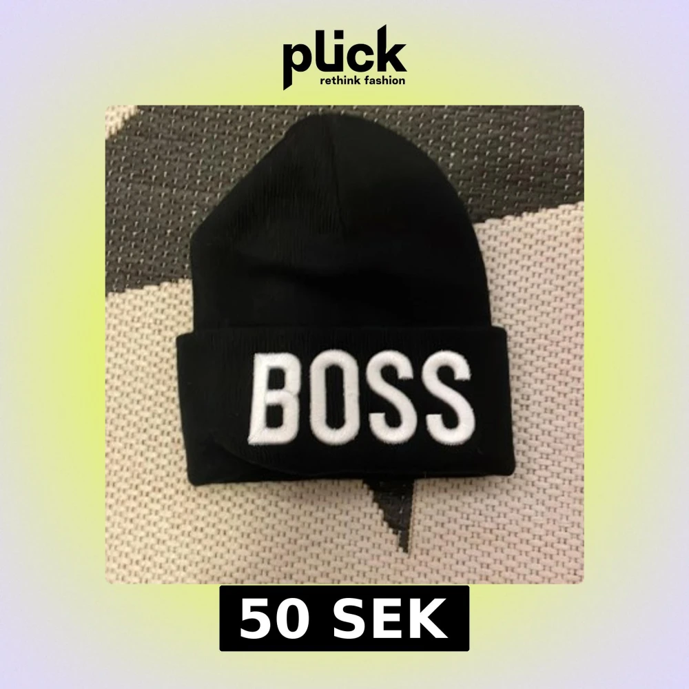 Snygg svart mössa med vit broderad text 'BOSS' framtill. Perfekt för att hålla värmen med stil.