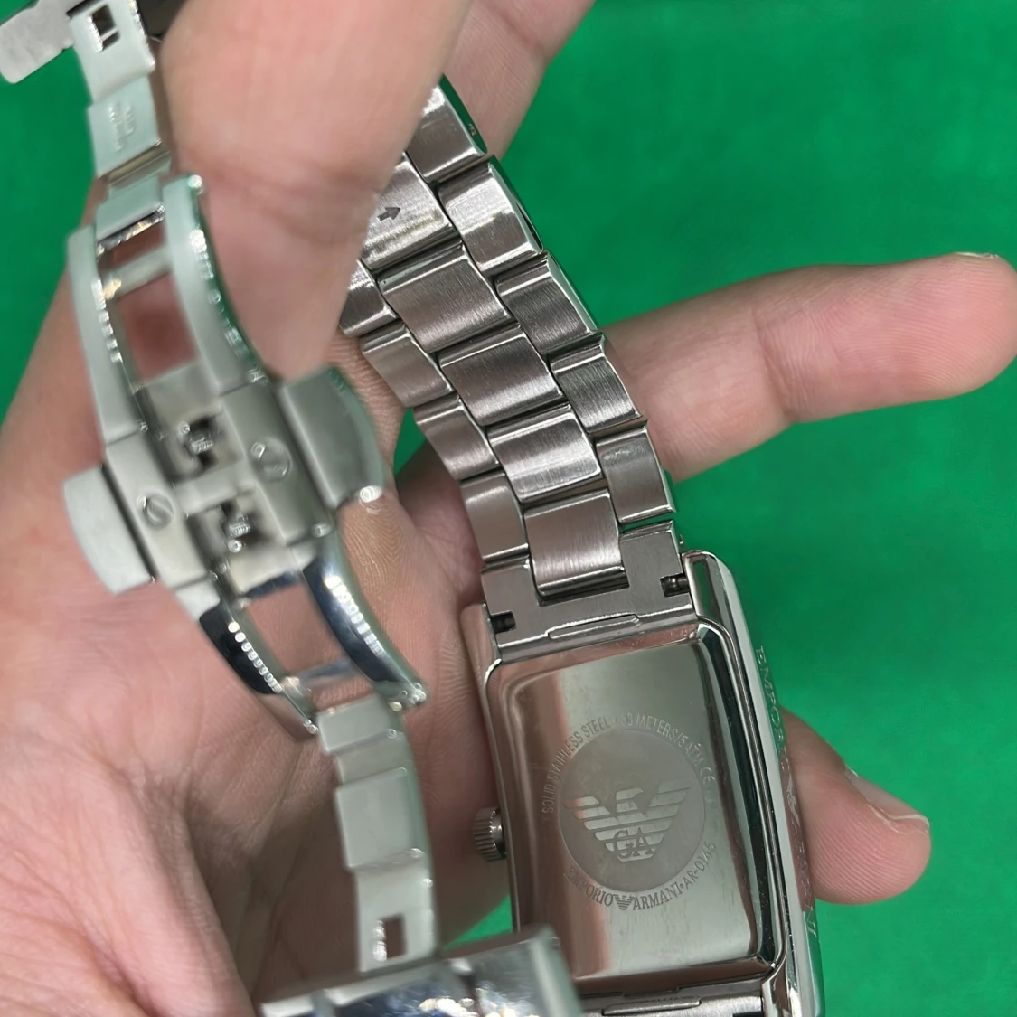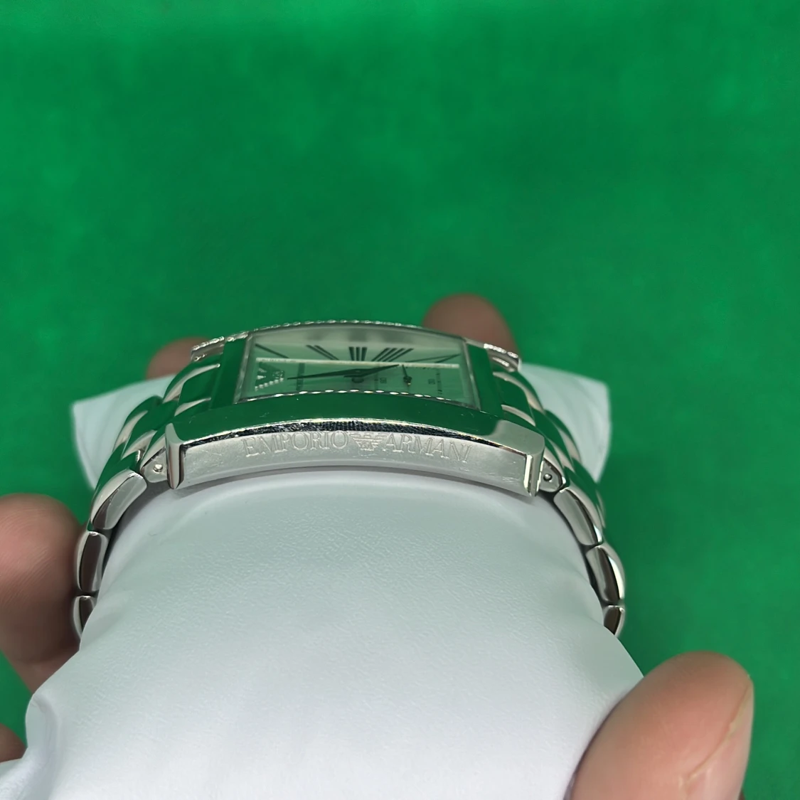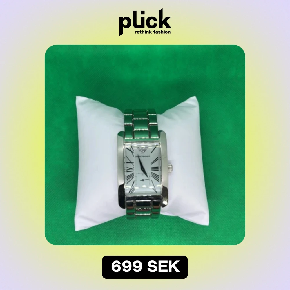 En elegant silverfärgad klocka från Emporio Armani med en rektangulär urtavla. Klockan har romerska siffror och en länkarmband i metall. Den har en klassisk och stilren design, perfekt för både vardag och fest. skick 10/10 använd ett fåtal gånger, batteri byte behövs 🙂