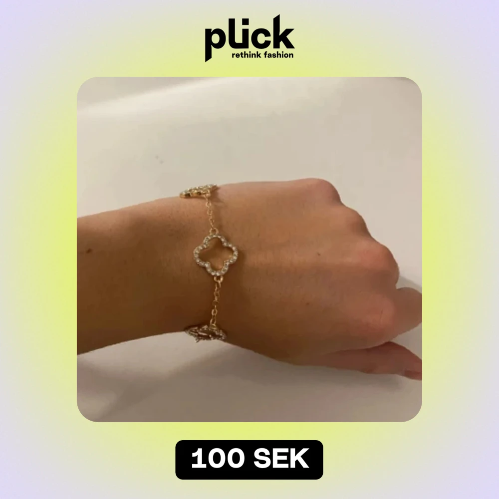 Säljer ett elegant guldarmband med en unik fyrklöverdesign. Armbandet har flera fyrklöverformade länkar som är dekorerade med gnistrande stenar. Perfekt för att ge en touch av glamour till vilken outfit som helst. Passar både till vardags och fest!
