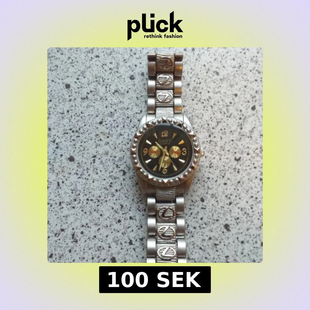 Säljer en cool Dany Quartz klocka med svart urtavla och guldiga detaljer. Armbandet är i silverfärgad metall med unika mönstrade länkar och dekorativa symboler. Klockan har en rund form och markerad boett med pärldetaljer runt urtavlan.