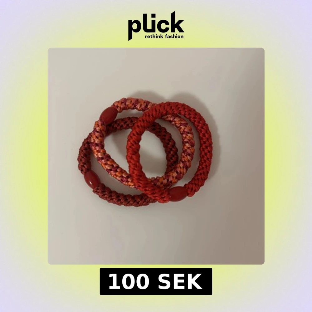 Tre flätade armband i olika nyanser av rött och rosa. Varje armband har en unik flätning och är dekorerat med små röda pärlor. Perfekt för att lägga till en färgklick till din outfit.
