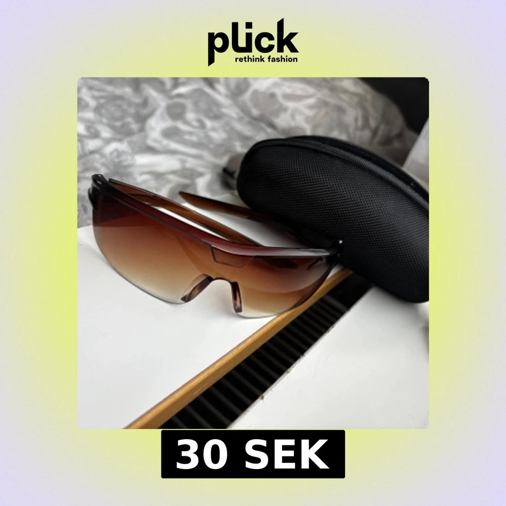 Säljer ett par bruna shield-solglasögon med snyggt tonade glas och sportig vibe. De har en svepande, futuristisk form och kommer med ett svart hårt fodral. Perfekta för dig som vill sticka ut med en cool look i sommar.