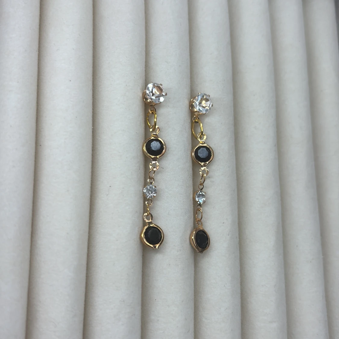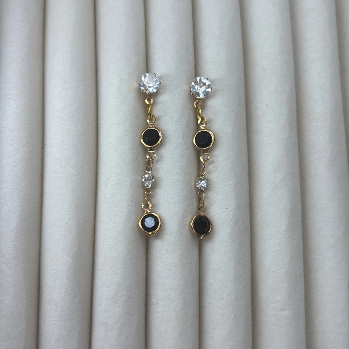 Säljer ett par eleganta örhängen i guldton med hängande design. Örhängena har växelvis svarta och klara stenar som ger en stilren och lyxig känsla. Perfekta för att lyfta din look!