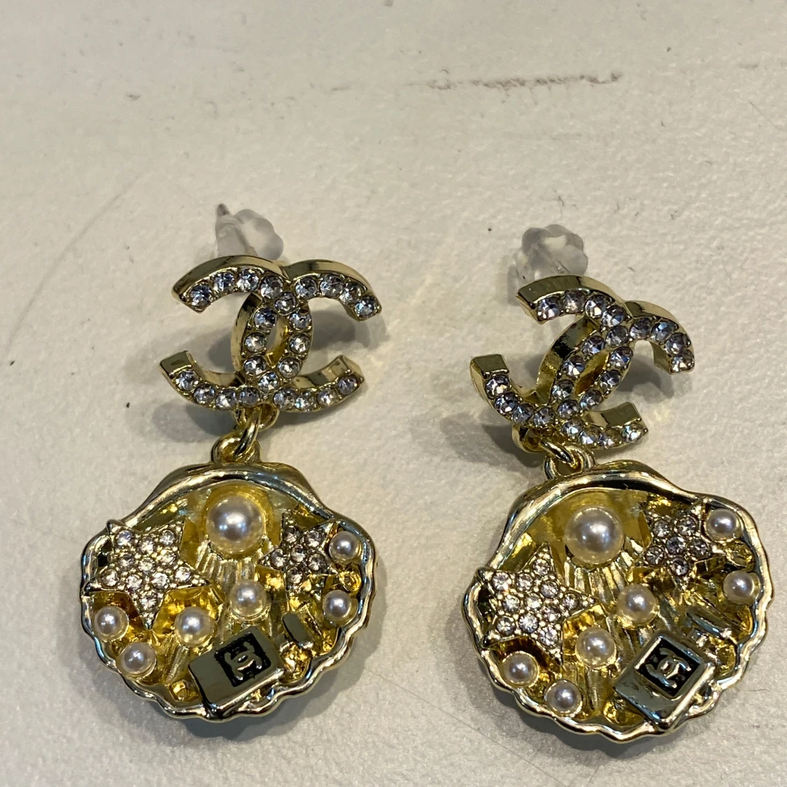 Unika örhängen i guld med snäckskalsformade hängen, dekorerade med pärlor, stjärnor och glittrande stenar. Örhängena är täckt av små kristaller. Perfekt för dig som vill sticka ut med lyxiga detaljer.