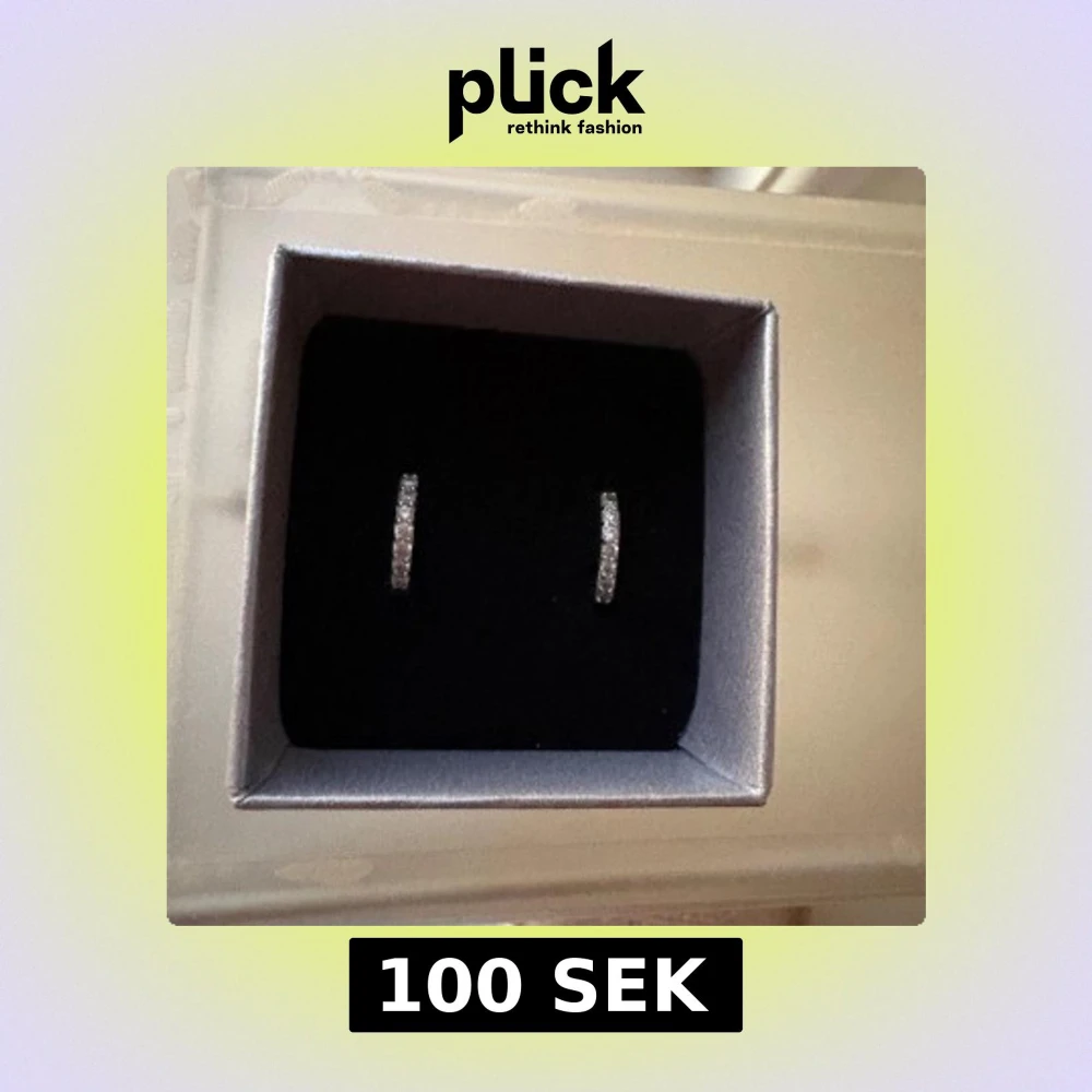 Säljer ett par snygga hoops i silverfärg med glittriga stenar längs hela ringen. Perfekta för dig som gillar stilrena och glittriga detaljer. Örhängena är tunna och har en klassisk rund form som passar till allt. Äkta silver.