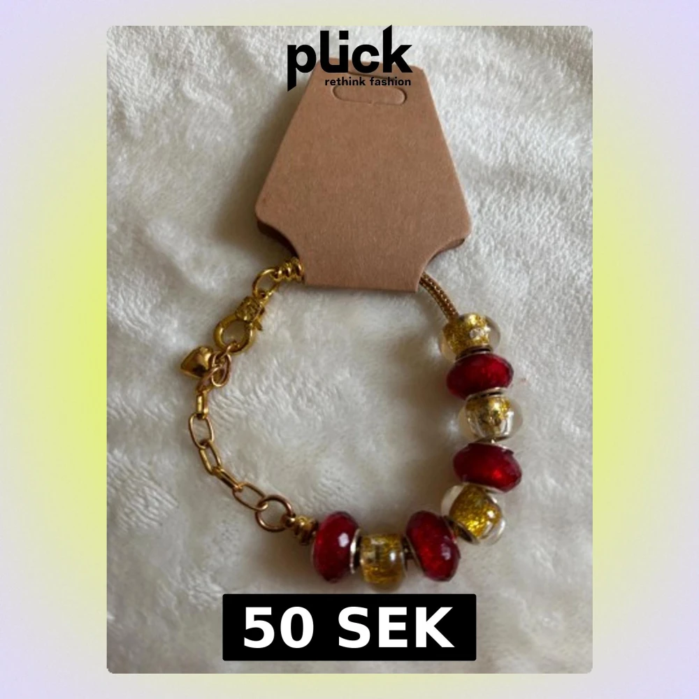 Snyggt armband i guldfärgad metall med stora röda och guldglittriga pärlor. Armbandet har en kedja med hjärtberlock och karbinlås. Perfekt accessoar för att lyfta din outfit med lite extra färg och bling.