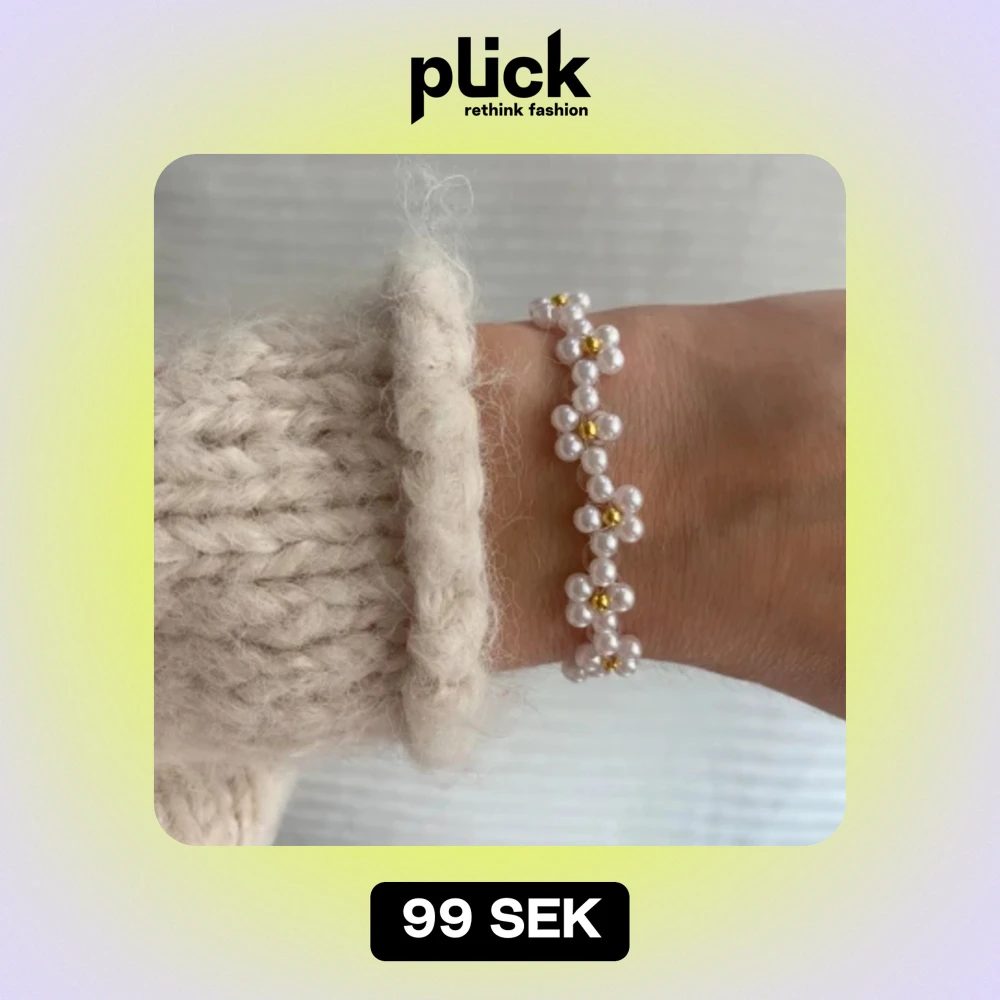 Jättefint pärlat armband med blommor - guldiga och vita pärlor. Så fint till sig själv eller att ge bort. Kommer med en vit sammetspåse.