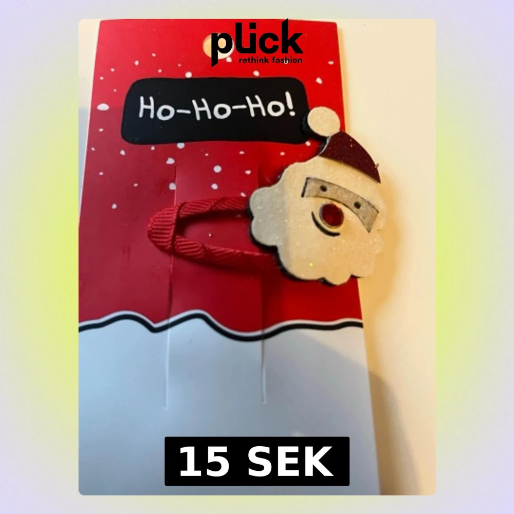 Säljer en söt hårklämma med en glittrig tomtefigur framtill. Klämman har röd tygdetalj och tomten har vitt ansikte, röd näsa och röd mössa. Perfekt accessoar för att piffa upp håret under julen!