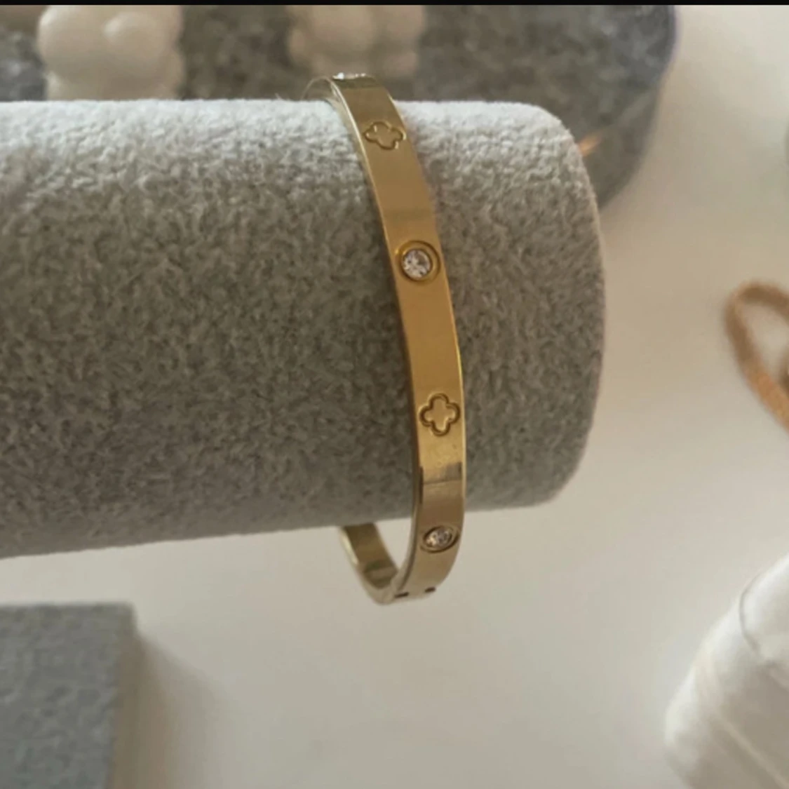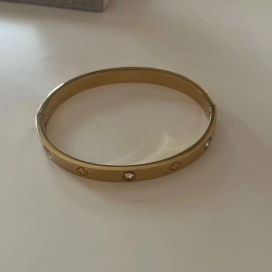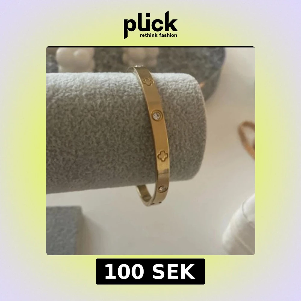 Snyggt armband i guldig metall med infällda klara stenar och ingraverade fyrklöverliknande symboler runt om. Stilren och modern design som ger en lyxig känsla till din outfit.