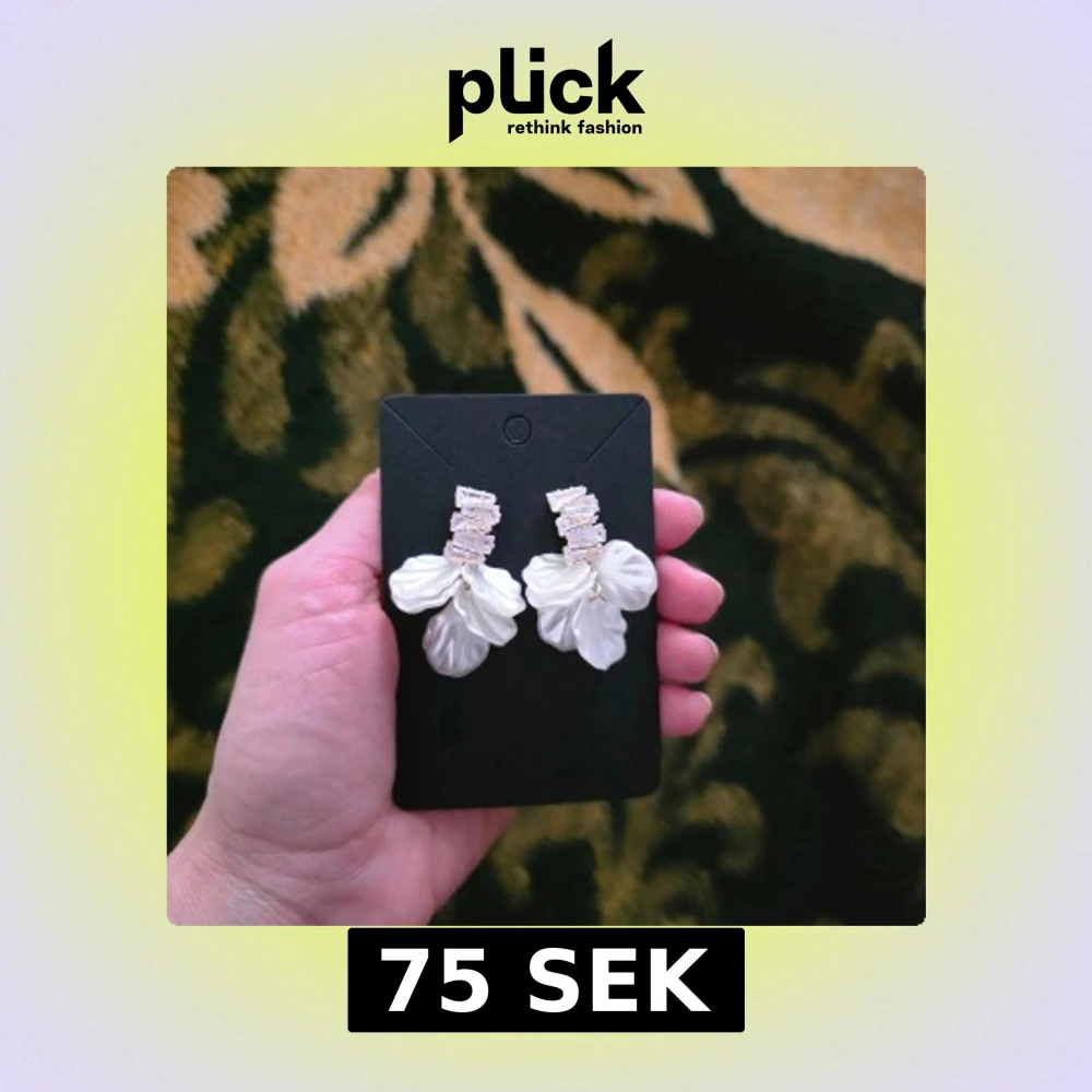 Eleganta vita örhängen med blommiga detaljer och glittrande kristaller. Perfekta för att ge en lyxig touch till din outfit. De har en unik design med pärlemorskimrande blommor och rektangulära kristaller som ger en vacker glans.