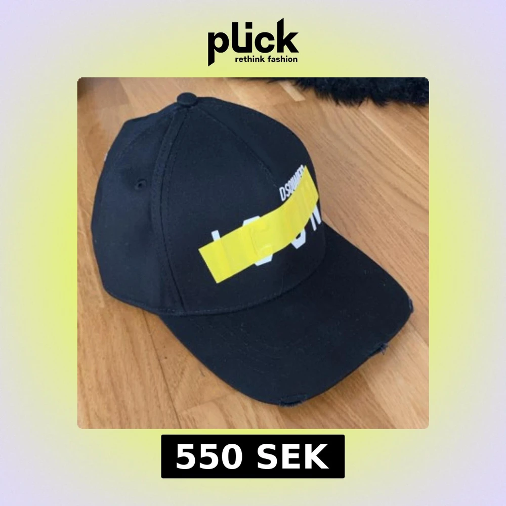 Äkta svart keps från Dsquared2 med vit broderad text baktill och en gul detalj framtill. Justerbart spänne i metall baktill. Klassisk böjd skärm och sex paneler.