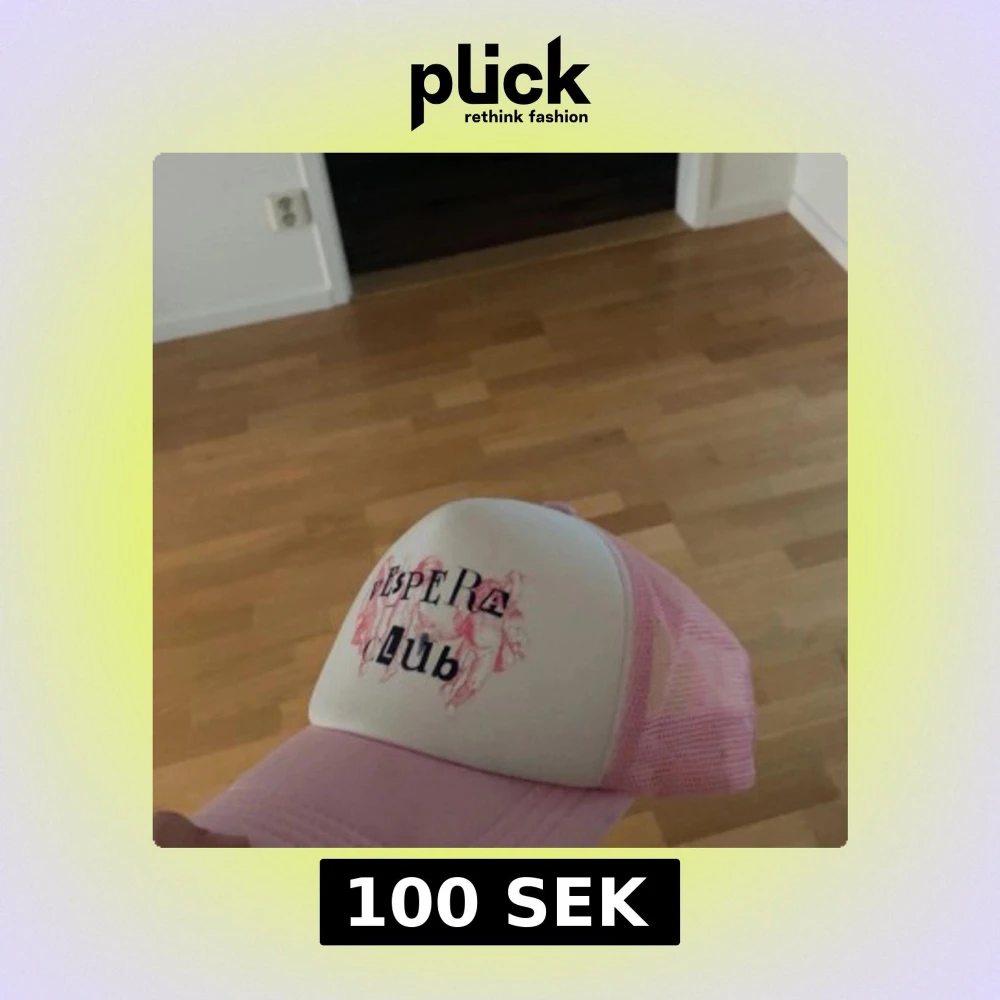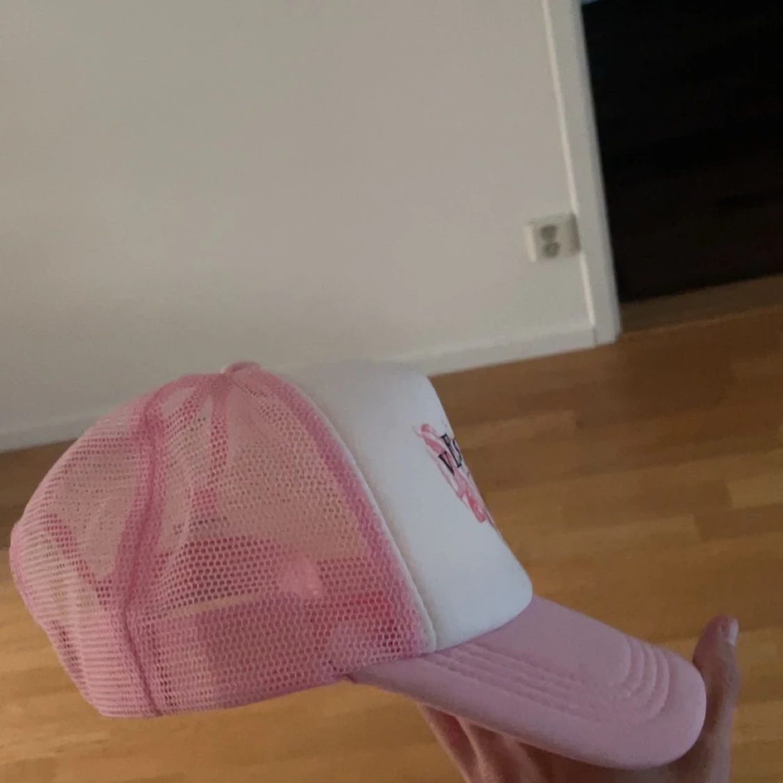 Säljer en rosa och vit truckerkeps från vespera Club. Kepsen har vit frontpanel med tryck och rosa mesh på sidor och bak, samt justerbar kepsen har en klassisk böjd skärm.