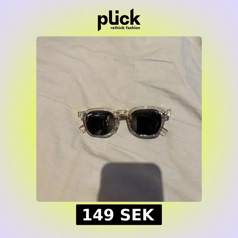 Snygga solglasögon med transparent båge och svarta linser. Bågarna har en unik, kantig design och detaljer på skalmarna som ger en extra touch. Perfekta för en stilren look.