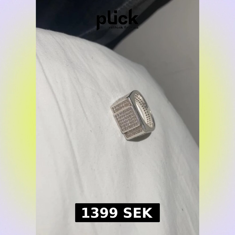 Säljer en bred och chunky silverring med rektangulär form och massor av små glittriga stenar på ovansidan och sidorna. Ringen har en cool, modern vibe och är tillverkad i 925 sterling silver. Perfekt för dig som gillar statement-smycken med extra bling. Ringer går får 3500 nypris