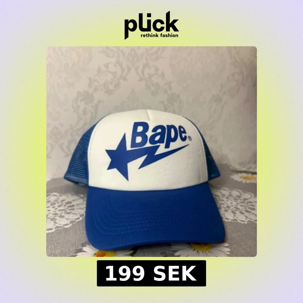 Två snygga truckerkepsar från Bape med klassisk mesh-baksida. Ena kepsen är blå och vit med blå stjärn- och blixtlogga, den andra är grön och vit med gul stjärna och grön logga. Perfekt accessoar för streetwear-stilen.
