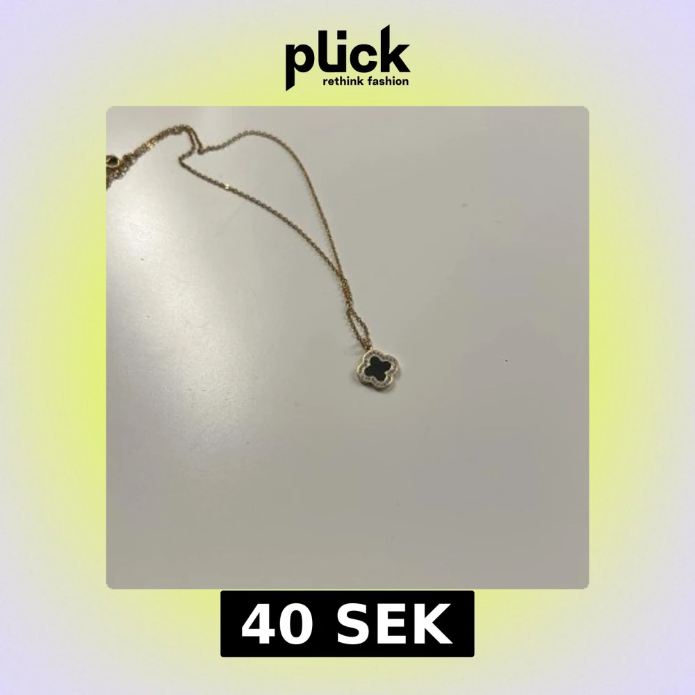 Supersnyggt halsband i guld med en liten fyrklöverformad berlock i svart. Runt berlocken sitter glittriga stenar som ger extra bling. Kedjan är tunn och elegant, perfekt för att lyfta din outfit med en cool detalj. Stainless steel