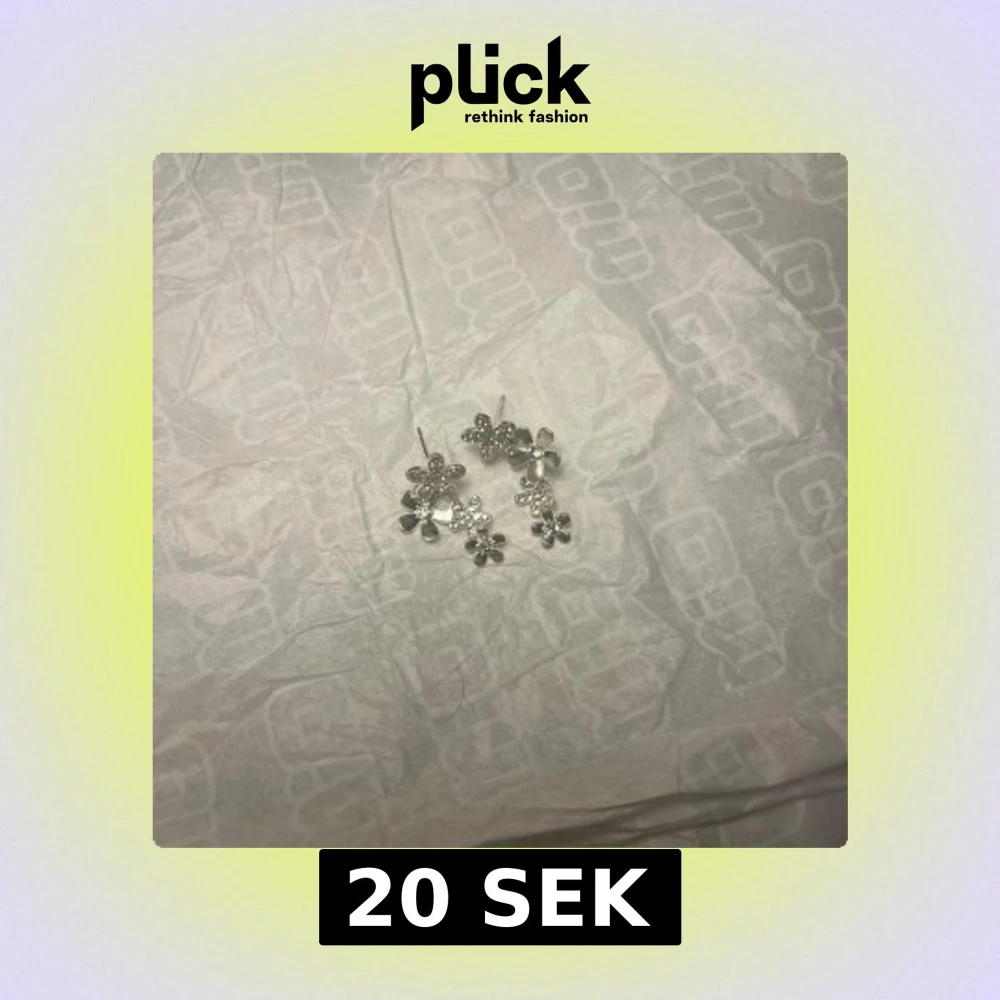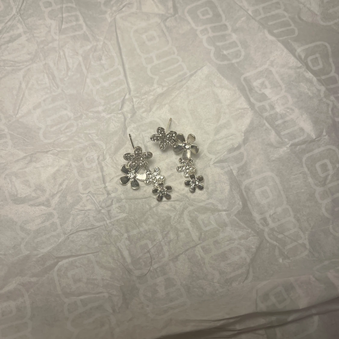 Supersöta silvriga örhängen med flera små blommor i olika storlekar. Blommorna har glittriga detaljer. Köpte från litet smyckesföretag så vet inte vilket material det är!