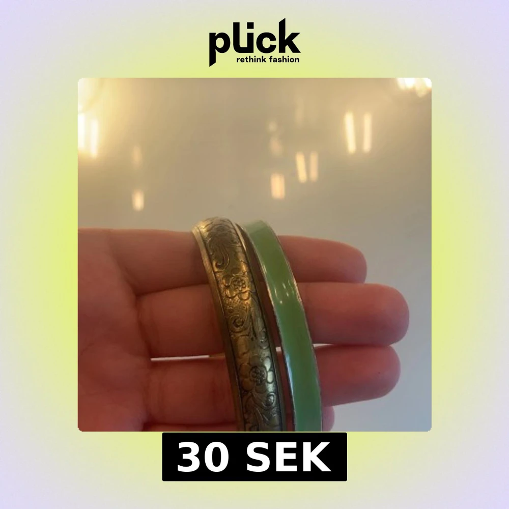 Säljer två armband, ett i silverfärgad metall med ingraverat blommönster och ett i blank grön emalj. Perfekta att bära tillsammans eller var för sig för en snygg detalj till din outfit.