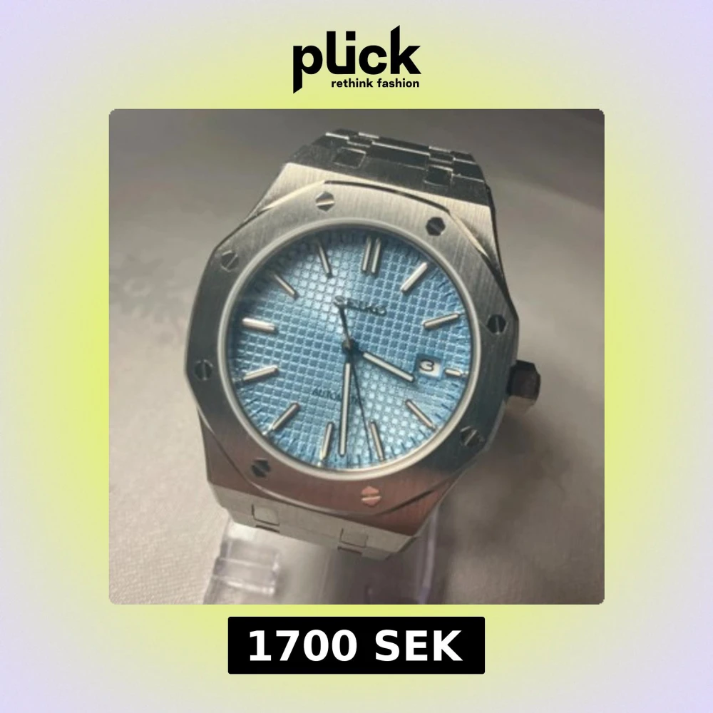 41mm automatisk klocka med åttakantig boett i borstat stål och länkarmband. Urtavlan är ljusblå med ett diskret rutmönster och silverfärgade index. Klockan har datumvisning och transparent baksida som visar urverket.