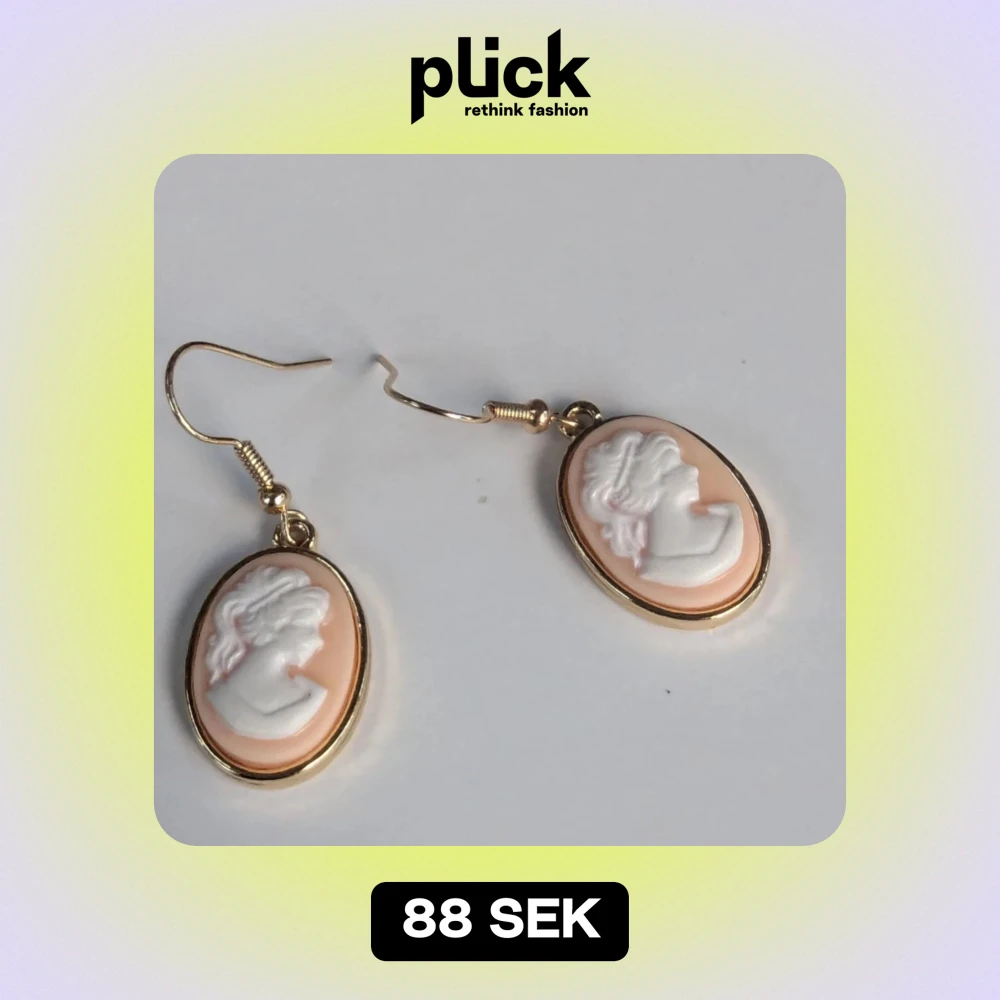 Eleganta vintageinspirerade cameo-örhängen med en klassisk design. De har en vacker vit profil av en kvinna mot en ljusrosa bakgrund, inramad i en gyllene oval.NYA Material, märke ospecificerat postar varje fredag, söndag