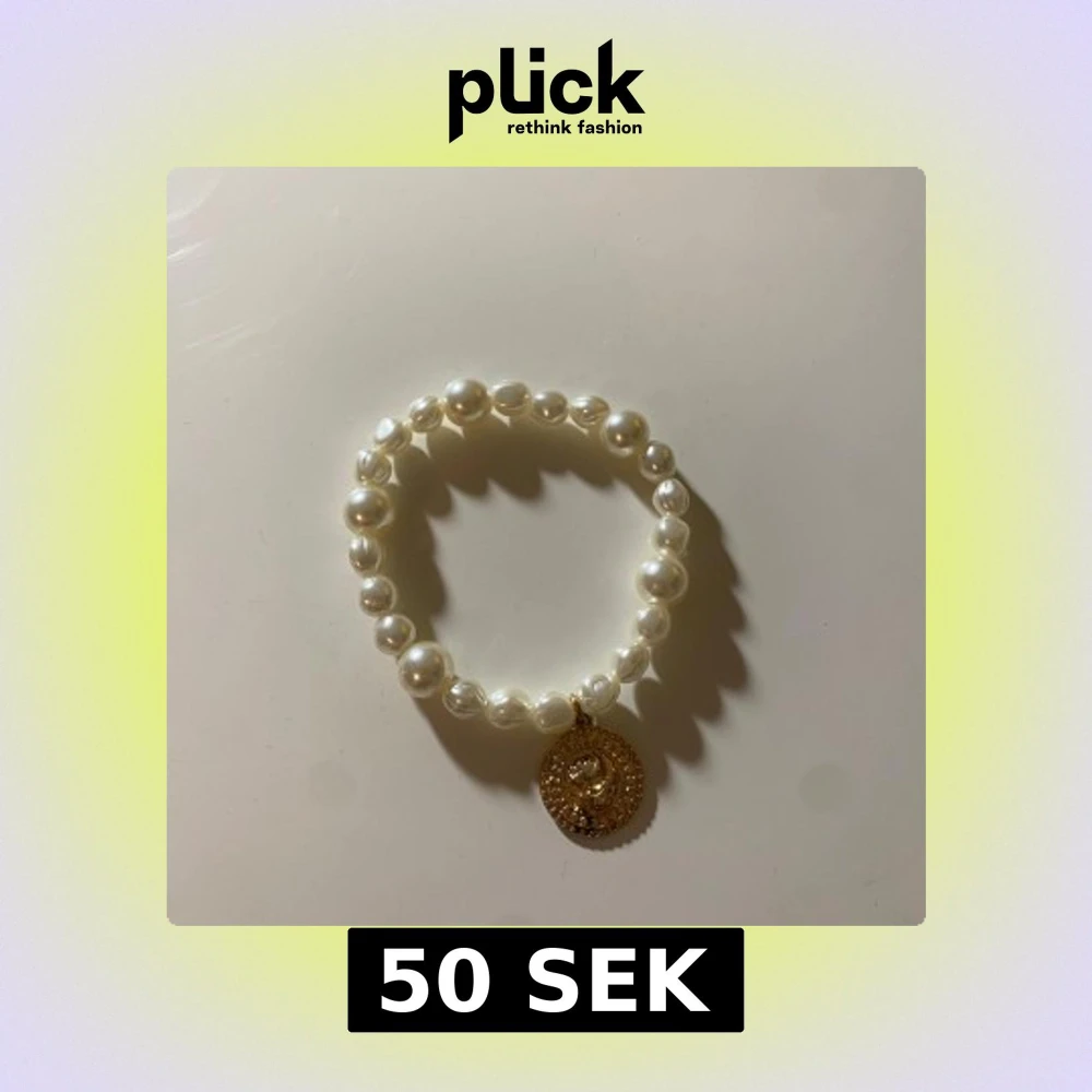 Elegant pärlarmband med vita pärlor och en rund guldberlock. Perfekt för att ge en touch av klass till din outfit. Berlocken har en detaljerad design som ger en extra lyxig känsla. Priset går att diskutera💗