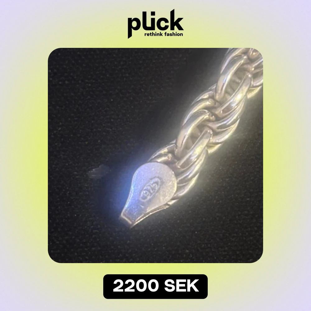 6mm bredd 55cm lång 92.5% silver 2600 nypris köpte under sommaren använder inte kan behöva bara poleras lite om man vill ha den vita färgen för den har oxideras lite.