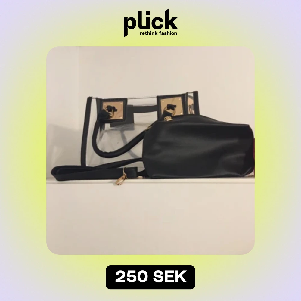 En fin genomskinlig väska passar regniga dagar med axelrem som går att ta bort och en svart lite nesesär . Jätte fin .