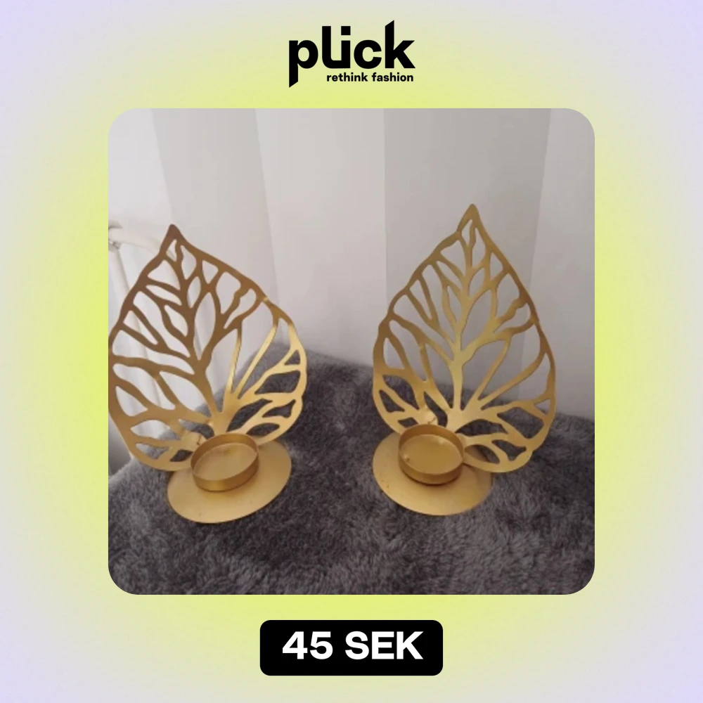Säljer ett par snygga ljusstakar i guld som är formade som löv. De har en stilren och modern design med ett utskuret mönster som liknar trädgrenar. Perfekta för att ge en elegant touch till ditt hem!