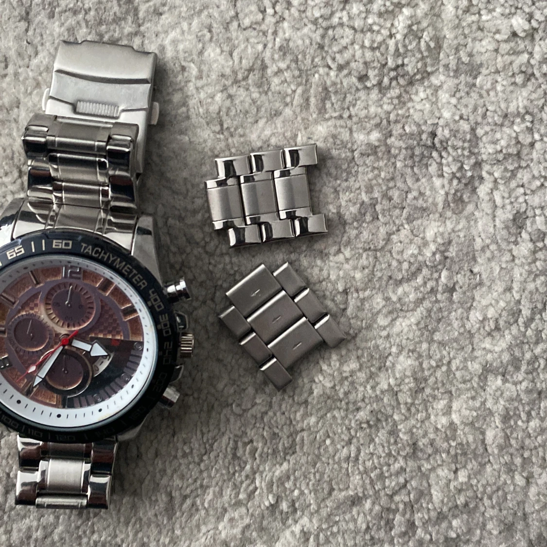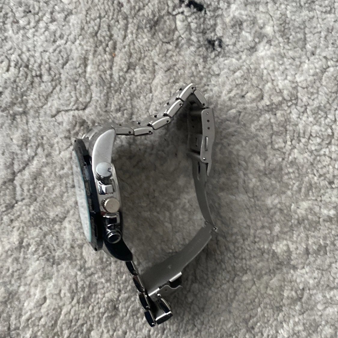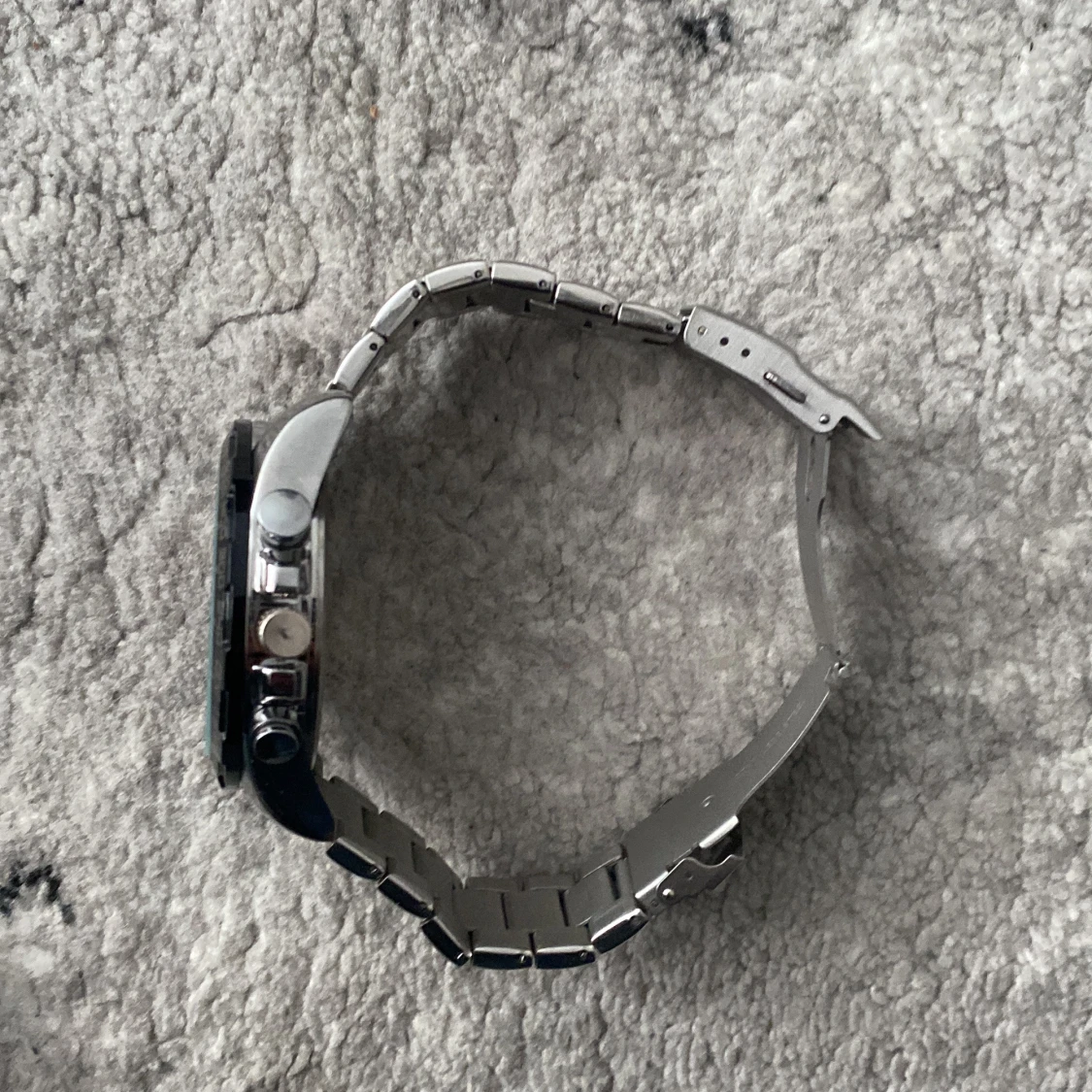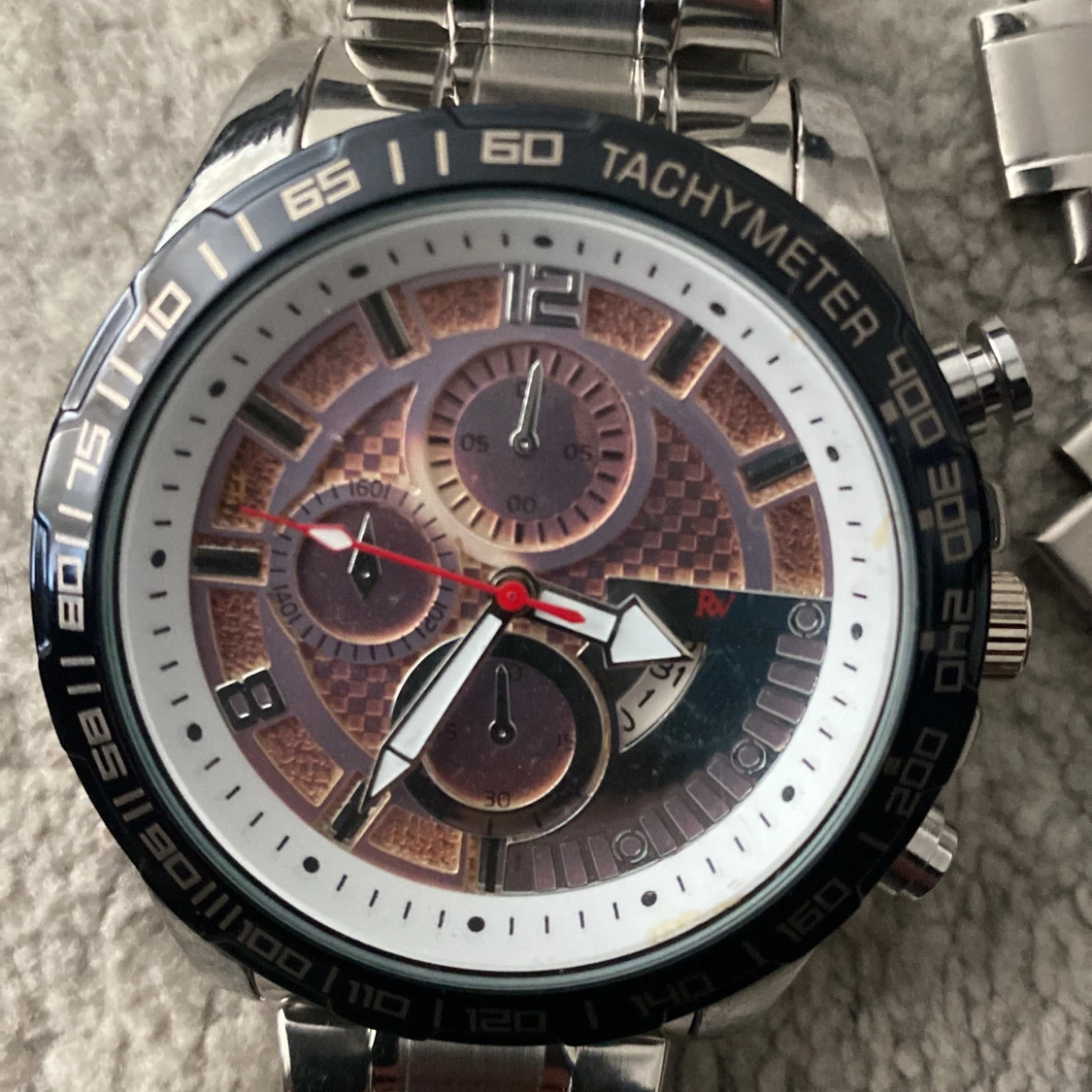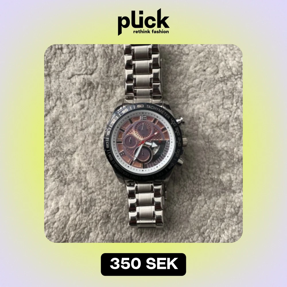 Säljer en snygg silverfärgad klocka med tachymeter runt urtavlan. Klockan har en robust metallarmband och en detaljerad urtavla med flera små urtavlor inuti. Perfekt för både vardag och fest! Extra länkar medföljer för justering av storleken.