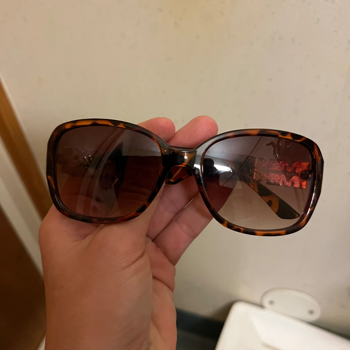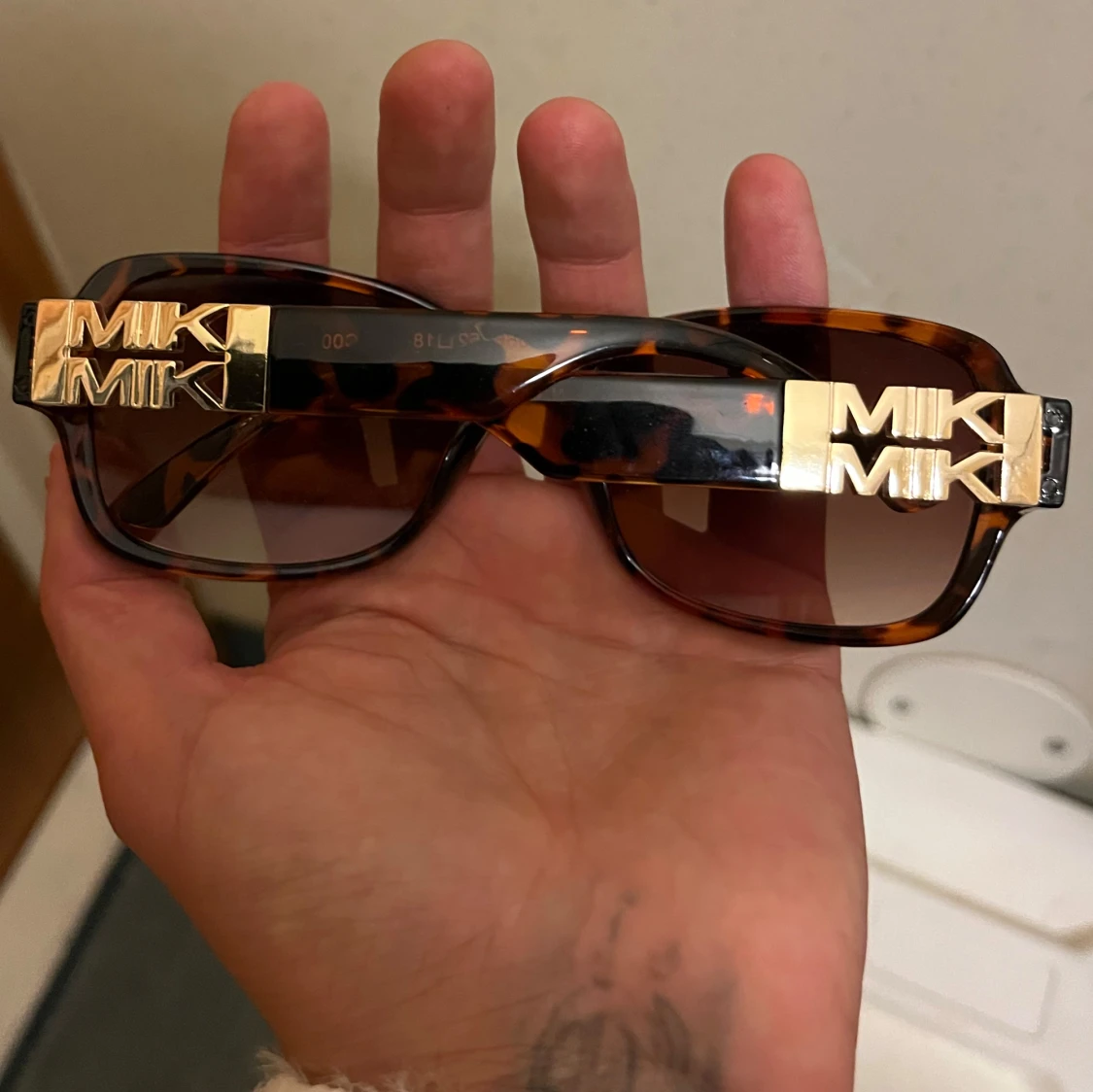 Snygga solglasögon med leopardmönster och stora fyrkantiga bågar. De har en cool guldig Miki-logga på sidorna som ger en lyxig touch. Perfekta för att sticka ut i mängden!