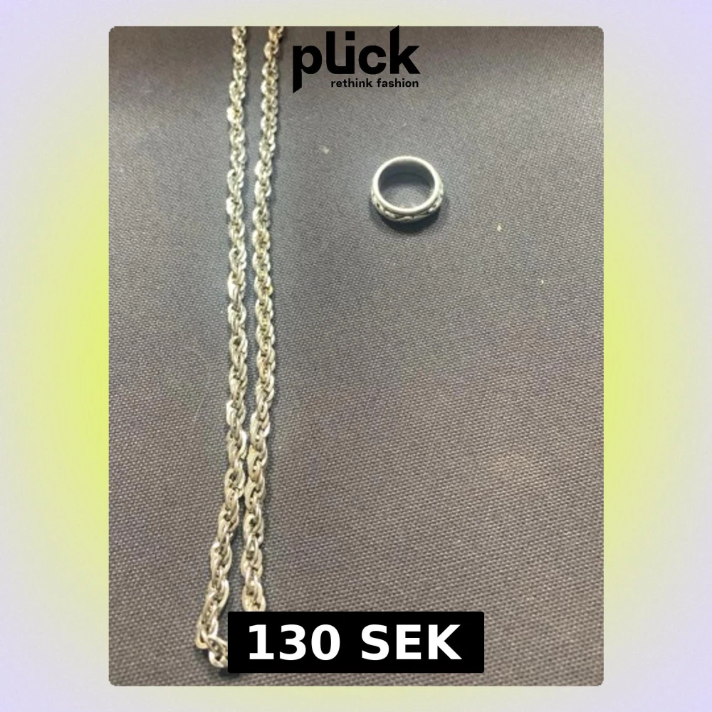 Bilden visar en silverfärgad kedja och en ring, ingen väst finns med på bilden.