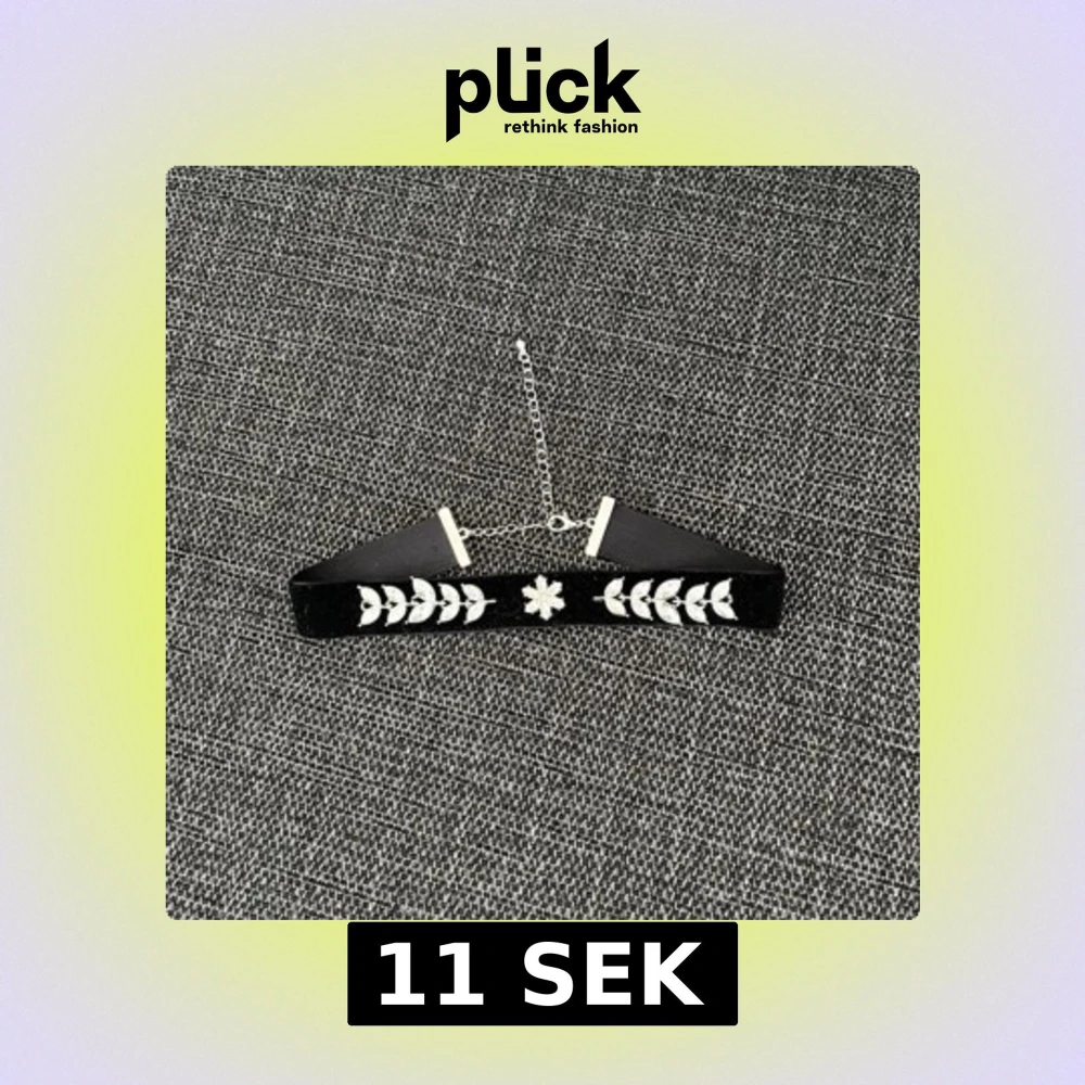 Snygg svart choker i sammet med silverfärgade detaljer och blommor av glittriga stenar. Halsbandet har justerbar kedja och blommönster i mitten, perfekt för att ge din outfit en cool och elegant touch.